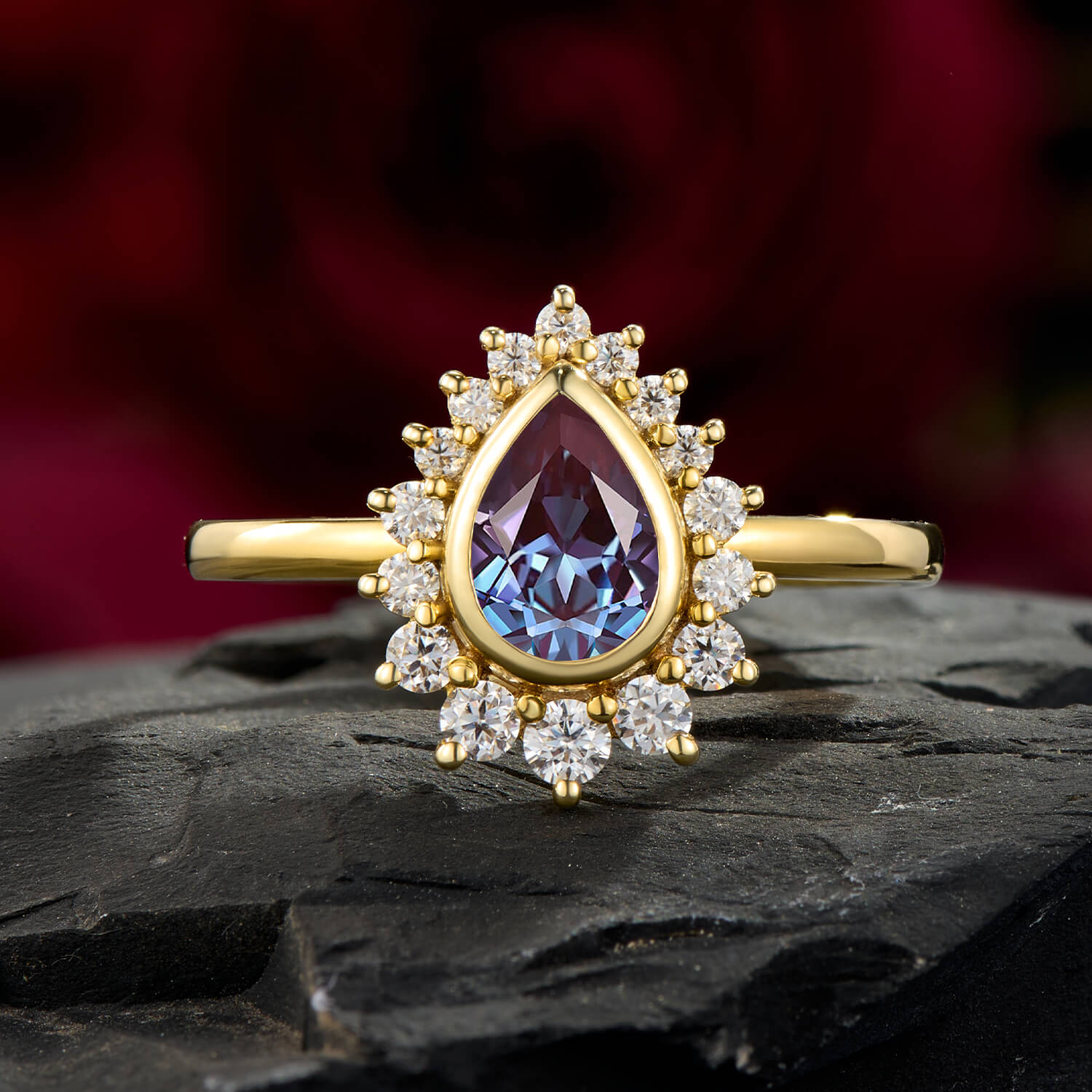 Radiant Halo Pear Cut Alexandrite Ring Polished Gold Luxury Engagement Ring