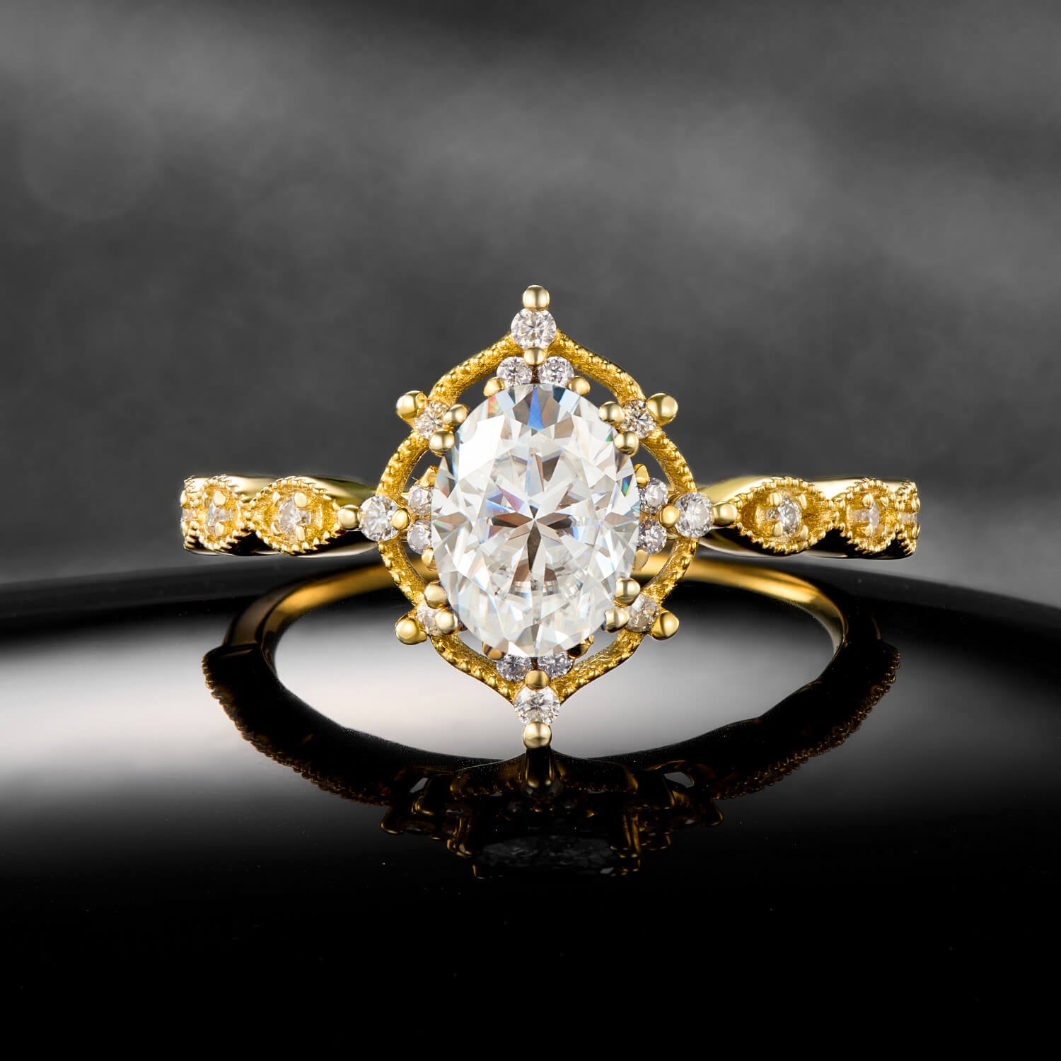 Brilliant Spark Oval Cut Moissanite Ring in Polished Gold Radiant Halo Engagement Ring