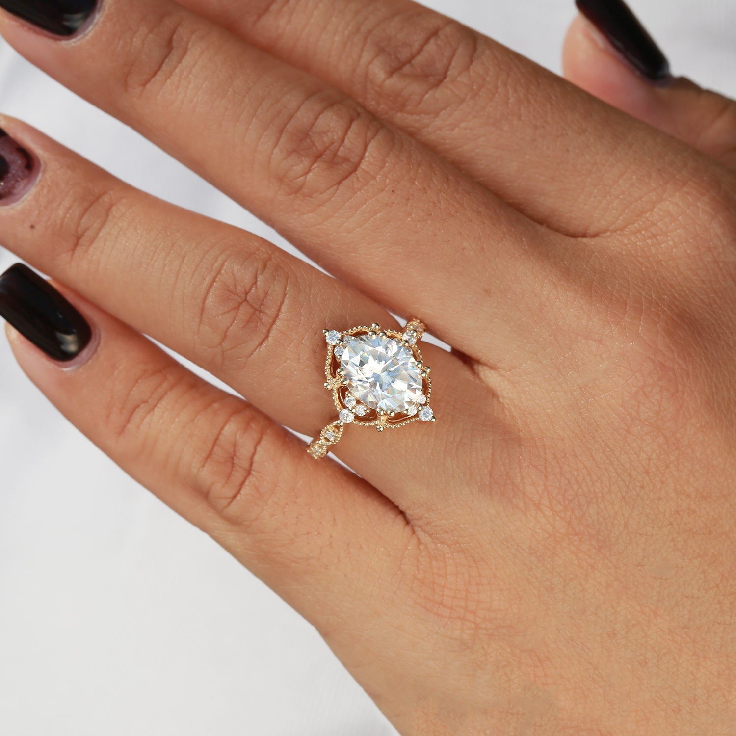 Expertly handcrafted, this ring blends vintage artistry with modern craftsmanship. Moissanite offers remarkable durability and diamond-like sparkle, making it an ethical and enduring choice for a lifetime of wear.