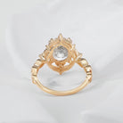At its center lies a luminous oval-cut moissanite, radiating exceptional brilliance and fire. The softly rounded silhouette enhances its classic beauty, while the delicate antique-inspired halo and subtle milgrain accents add depth, texture, and an old-world charm that frames the center stone gracefully.