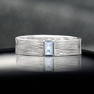 At its center rests a serene blue emerald-cut simulated aquamarine, radiating a calm, ocean-inspired glow that symbolizes clarity, peace, and harmony. The hand-hammered and brushed texture creates a raw yet refined surface, reflecting the strength and individuality of your bond.