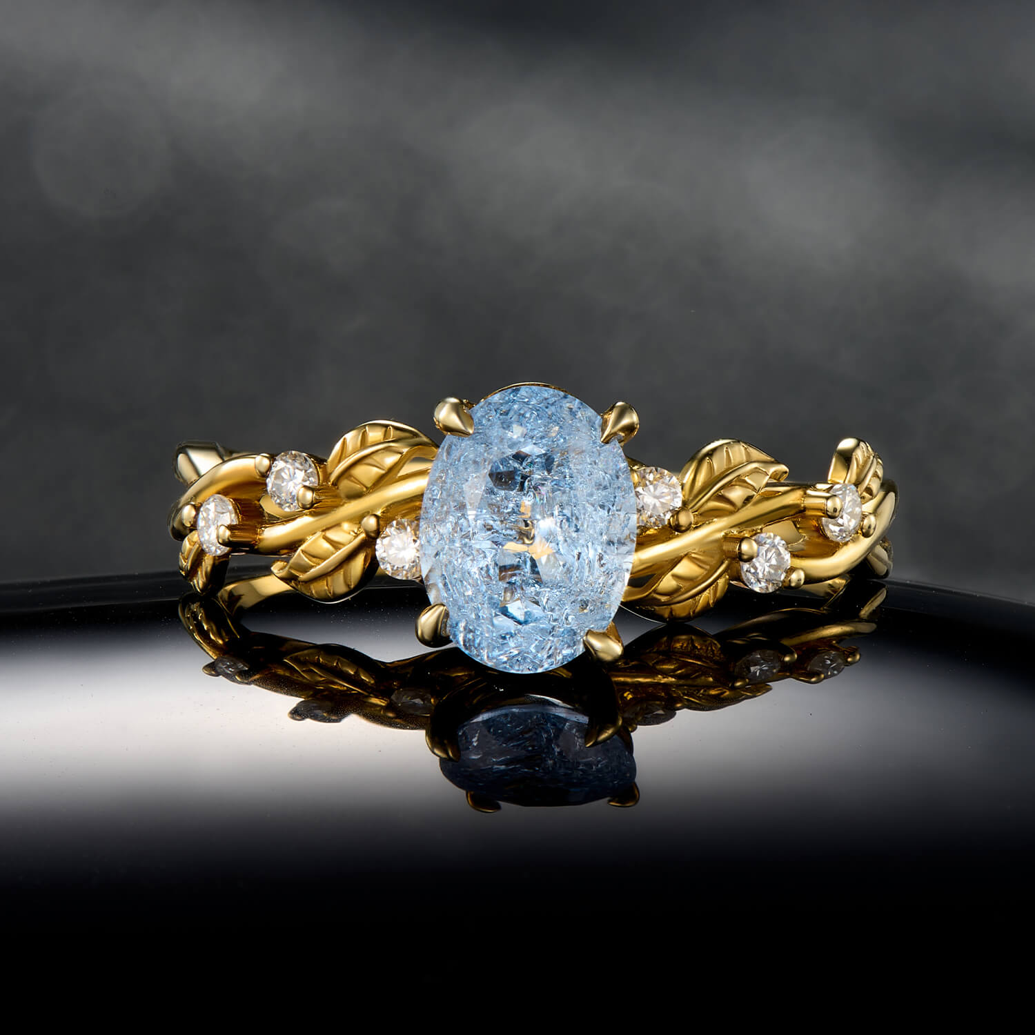 At its center lies a captivating oval-cut aquamarine, radiating a tranquil icy blue hue that symbolizes clarity, courage, and harmony. The gemstone is securely set in a four-prong setting, held by a gold branch-style band that evokes natural beauty and organic movement. Carefully placed side stones of moissanite or diamond enhance the brilliance of the center stone while maintaining a balanced, refined profile.