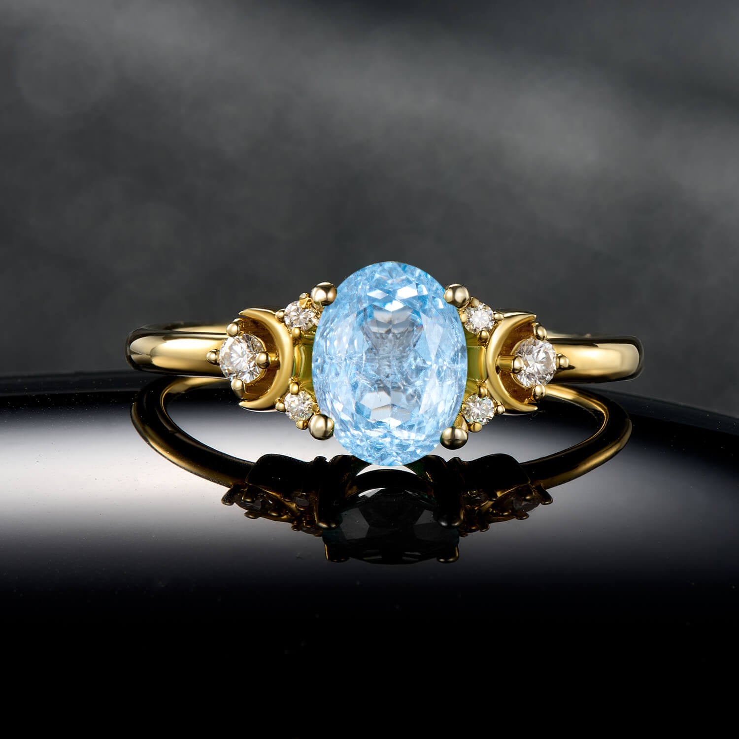 Crescent-inspired side accents and carefully set Moissanite stones enhance the brilliance of the central gem, adding depth and subtle sparkle while maintaining a refined, harmonious profile. Every movement brings the ice-cut facets to life, creating a luxurious yet wearable design.