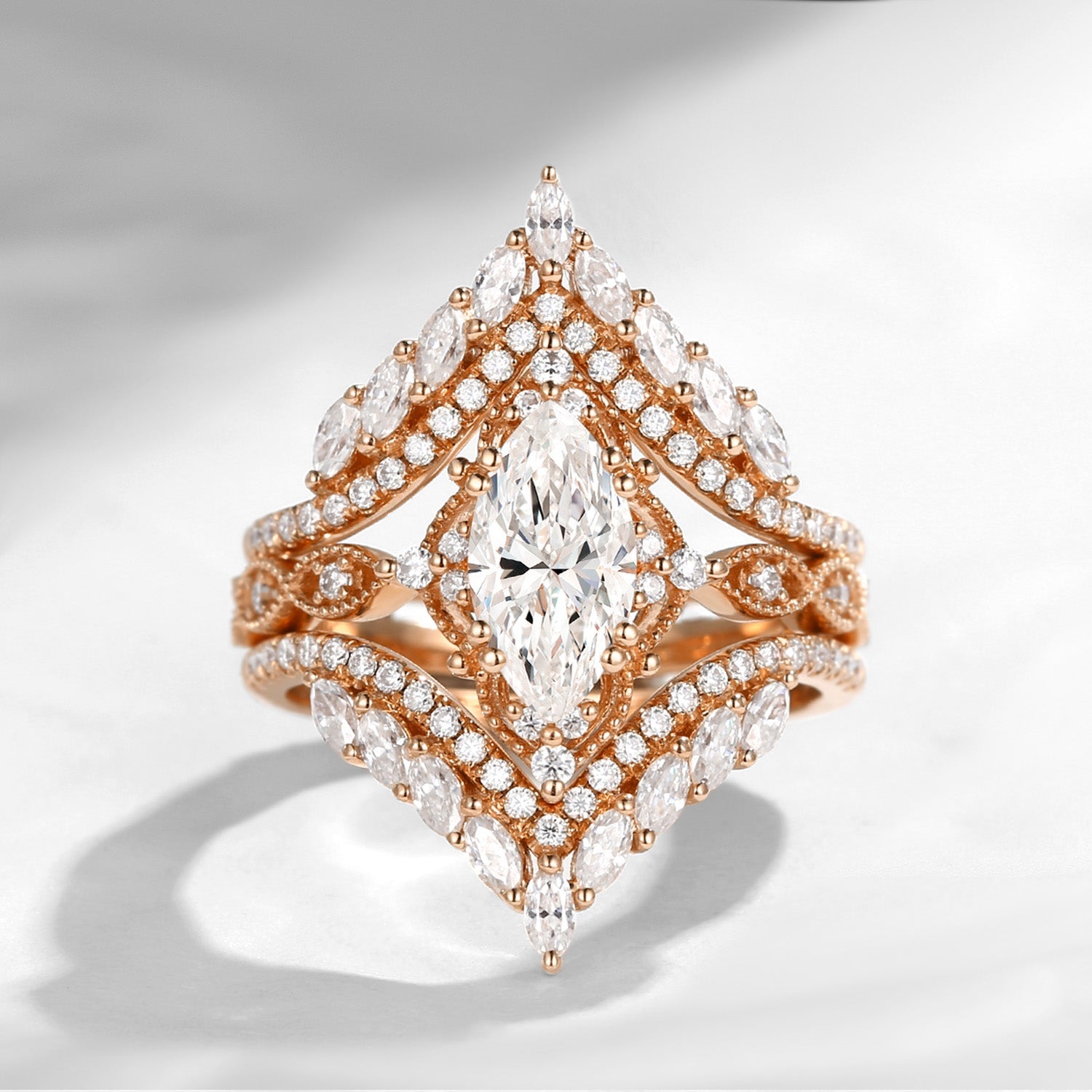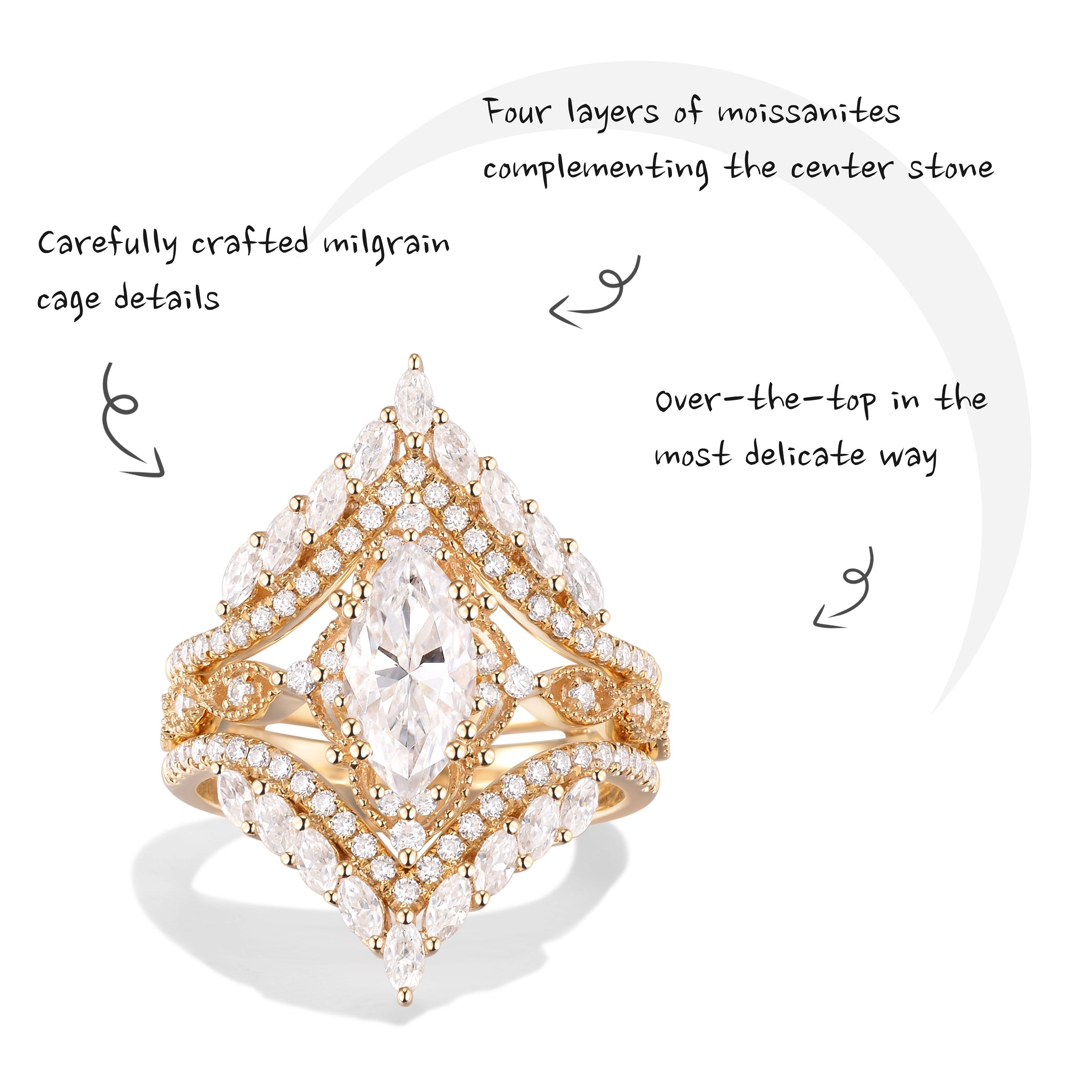 Vintage Style Marquise Moissanite Cage Ring Bridal Set 2pcs