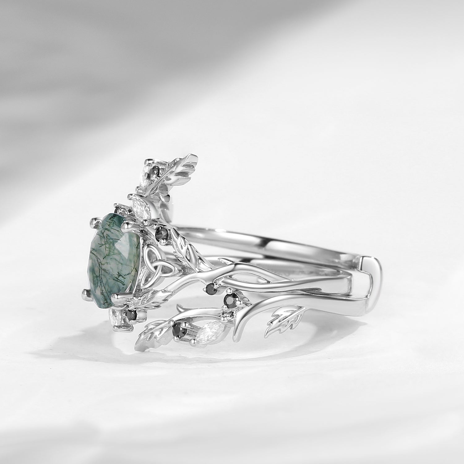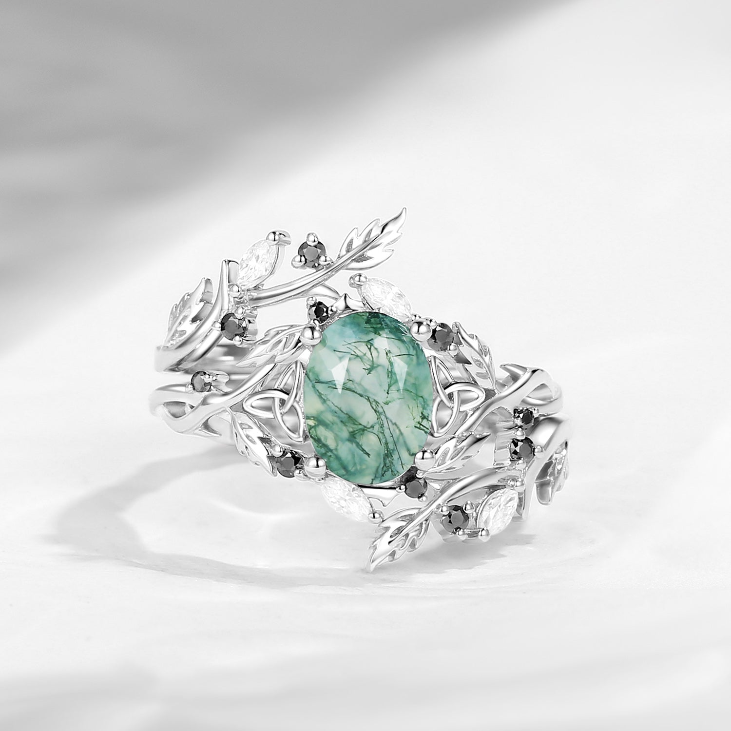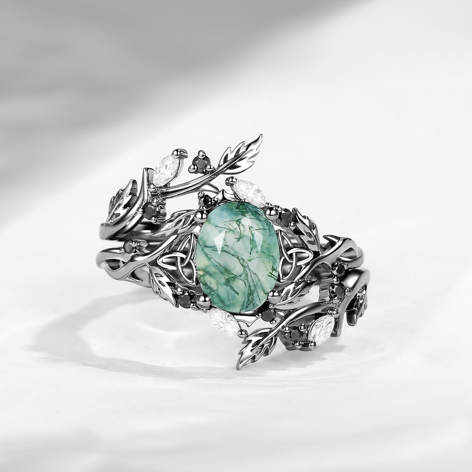 Celtic Calender | 3.18-4.14 | Nature Inspired Celtic Twist Oval Cut Moss Agate Alder Leaf Engagement Ring Set 2pcs