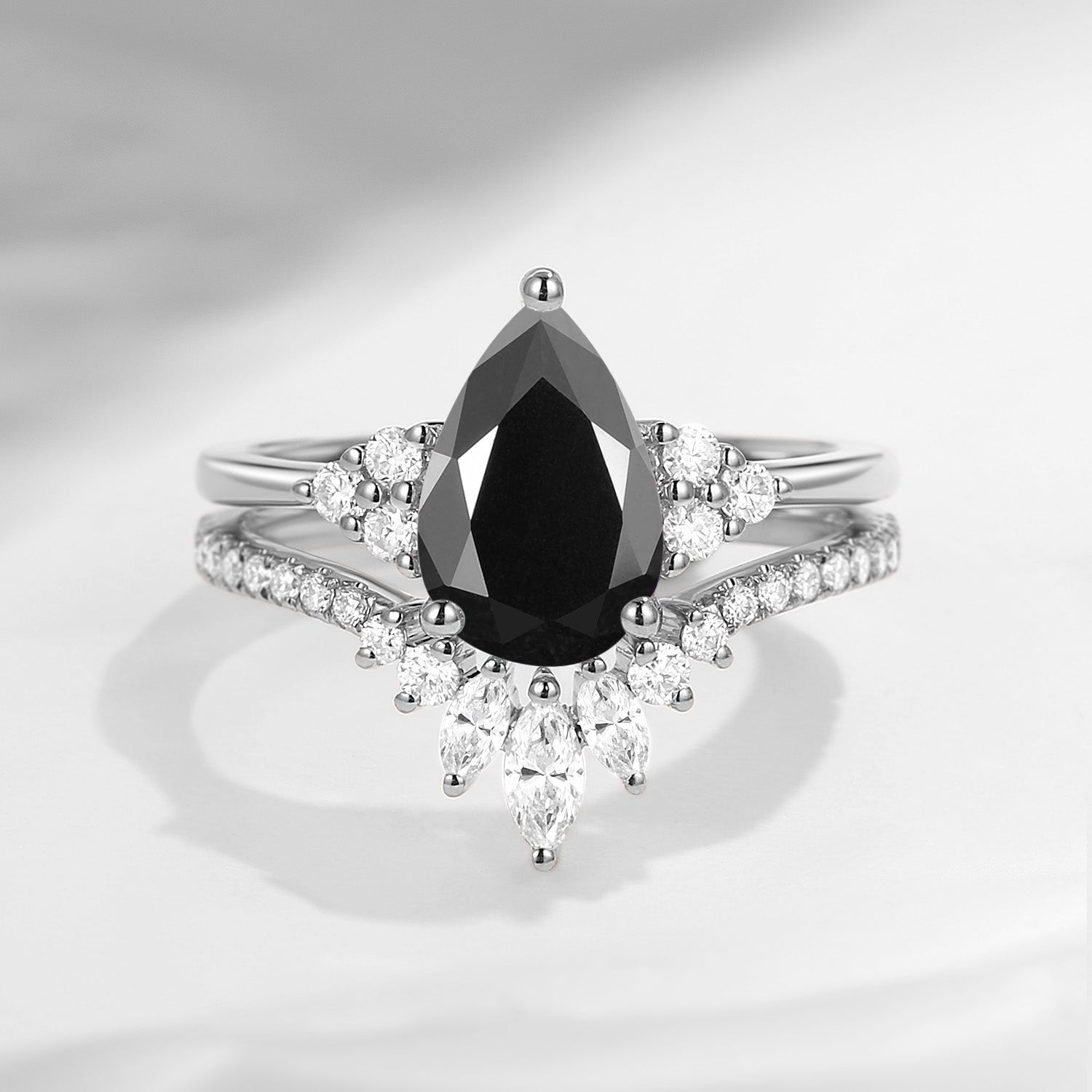 Pear Cut Black Moissanite Cluster Engagement Ring Set 2pcs - Vivian