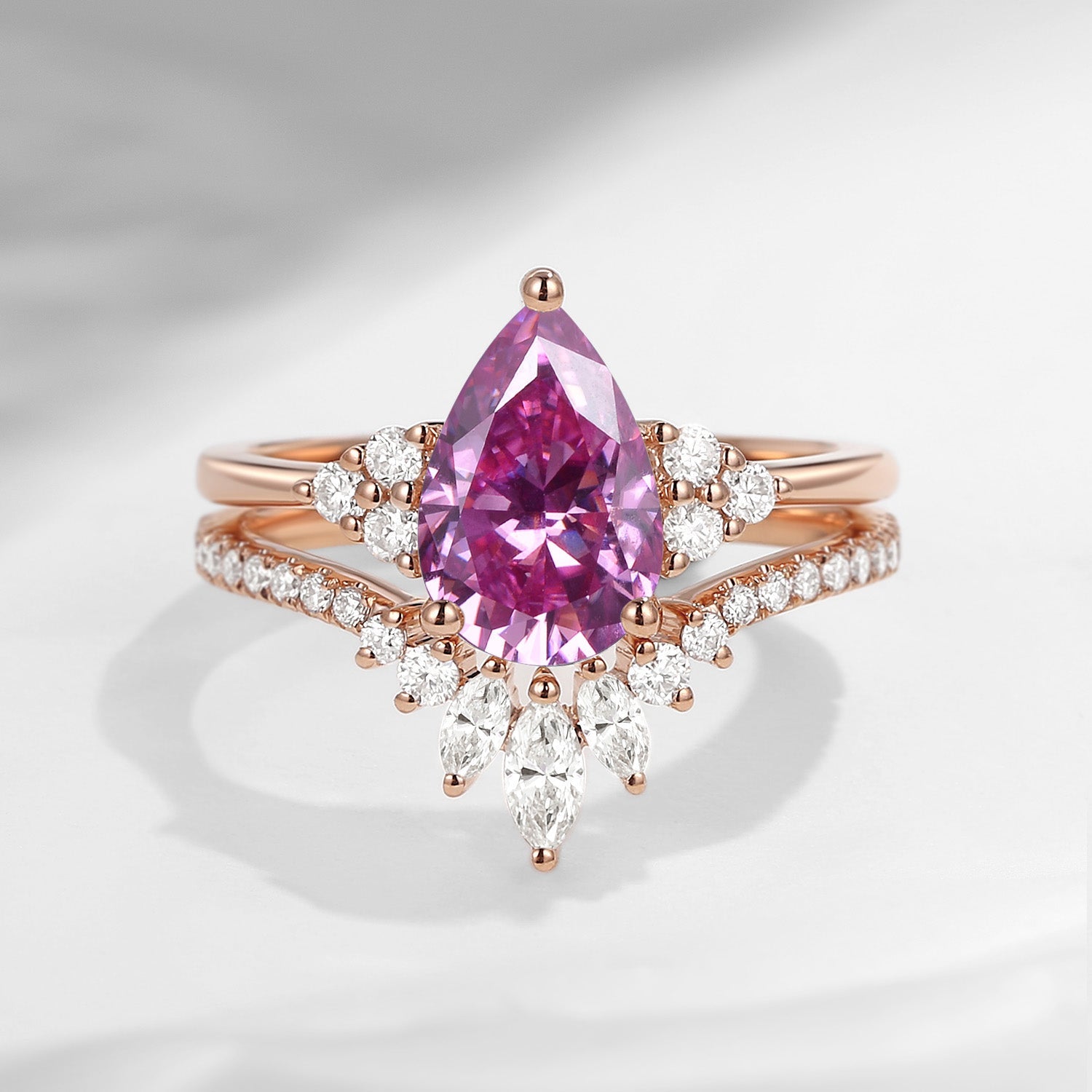 Pear Cut Pink Moissanite Cluster Engagement Ring Set 2pcs - Vivian