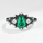 Step into a world of dark elegance with this Emerald Ring, a bold gothic statement crafted for those drawn to mystery and power. At its center rests a striking coffin-cut emerald, glowing with a vivid green hue that symbolizes renewal, strength, and forbidden beauty. The elongated silhouette enhances depth and drama, creating a commanding presence on the hand.