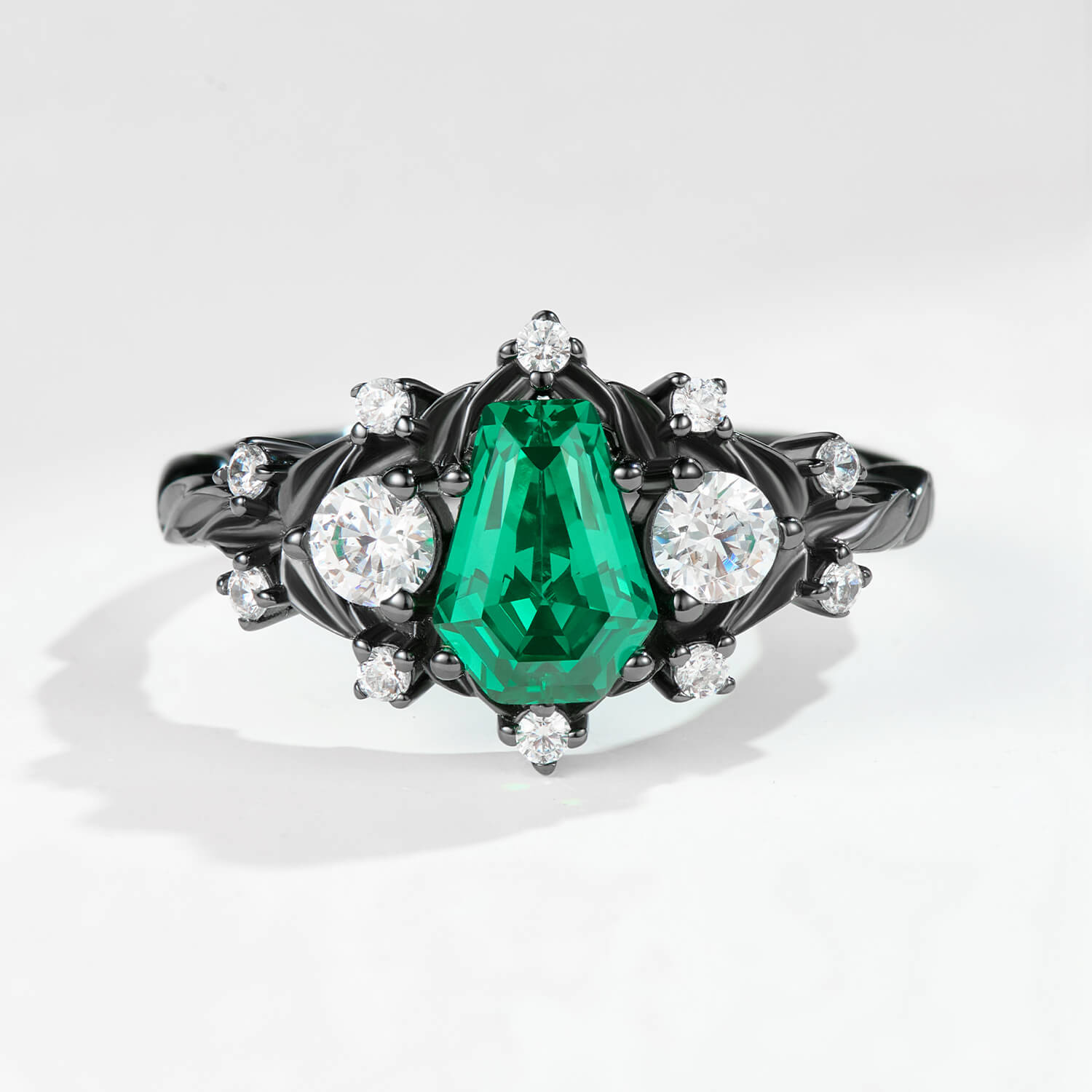 Encased in sculptural black gold, the emerald is framed by intricate organic detailing inspired by gothic architecture and shadowed vines. Brilliant round-cut moissanite or diamond accents flank the center stone, adding contrast and celestial sparkle while emphasizing the rich color of the emerald. Every angle reveals thoughtful craftsmanship and dramatic balance.