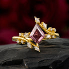 Enchanting Kite Cut Purple-Red Morganite Ring in Gold Nature-Inspired Leaf Accent Statement Engagement Ring
