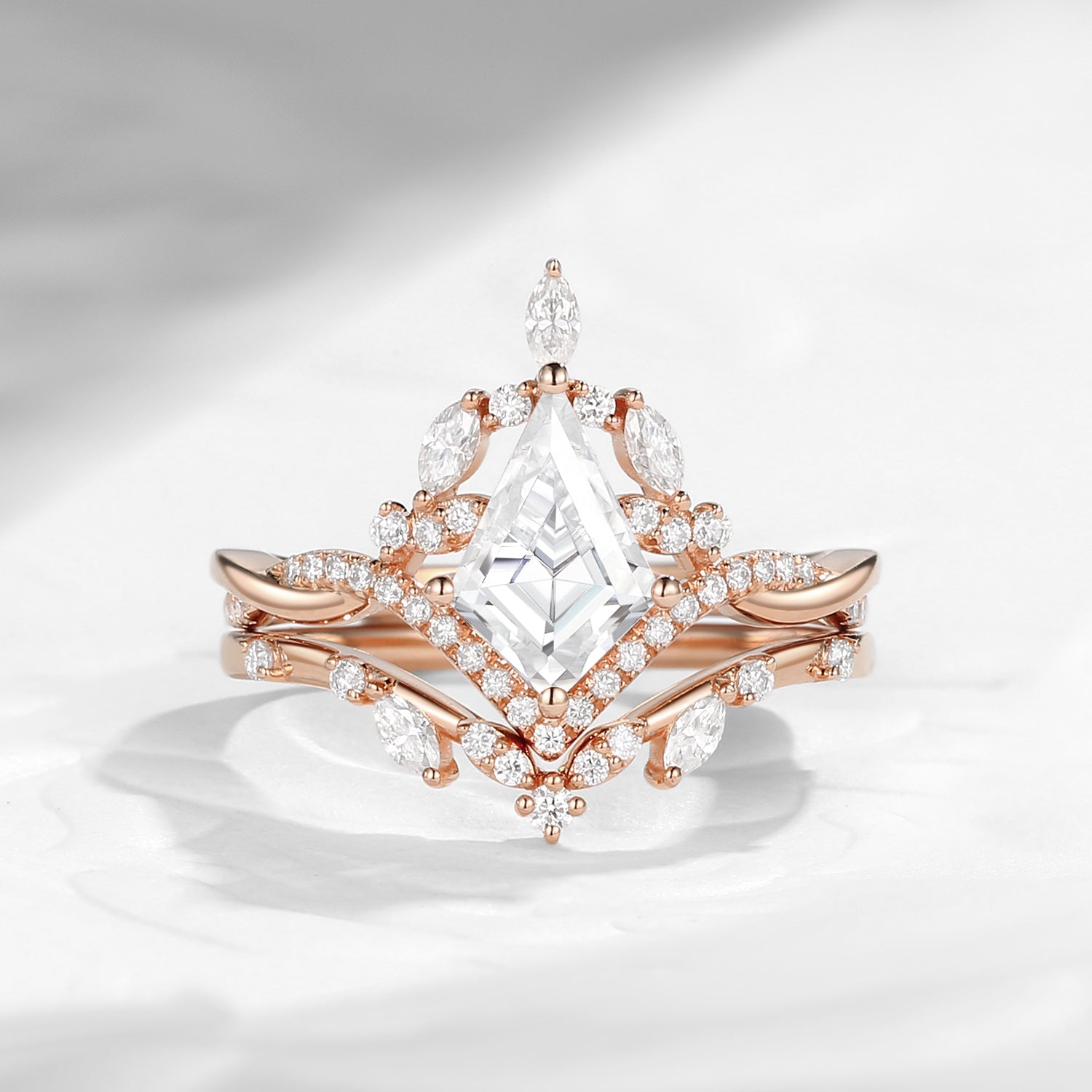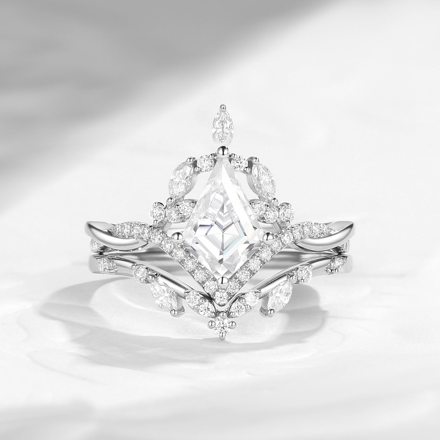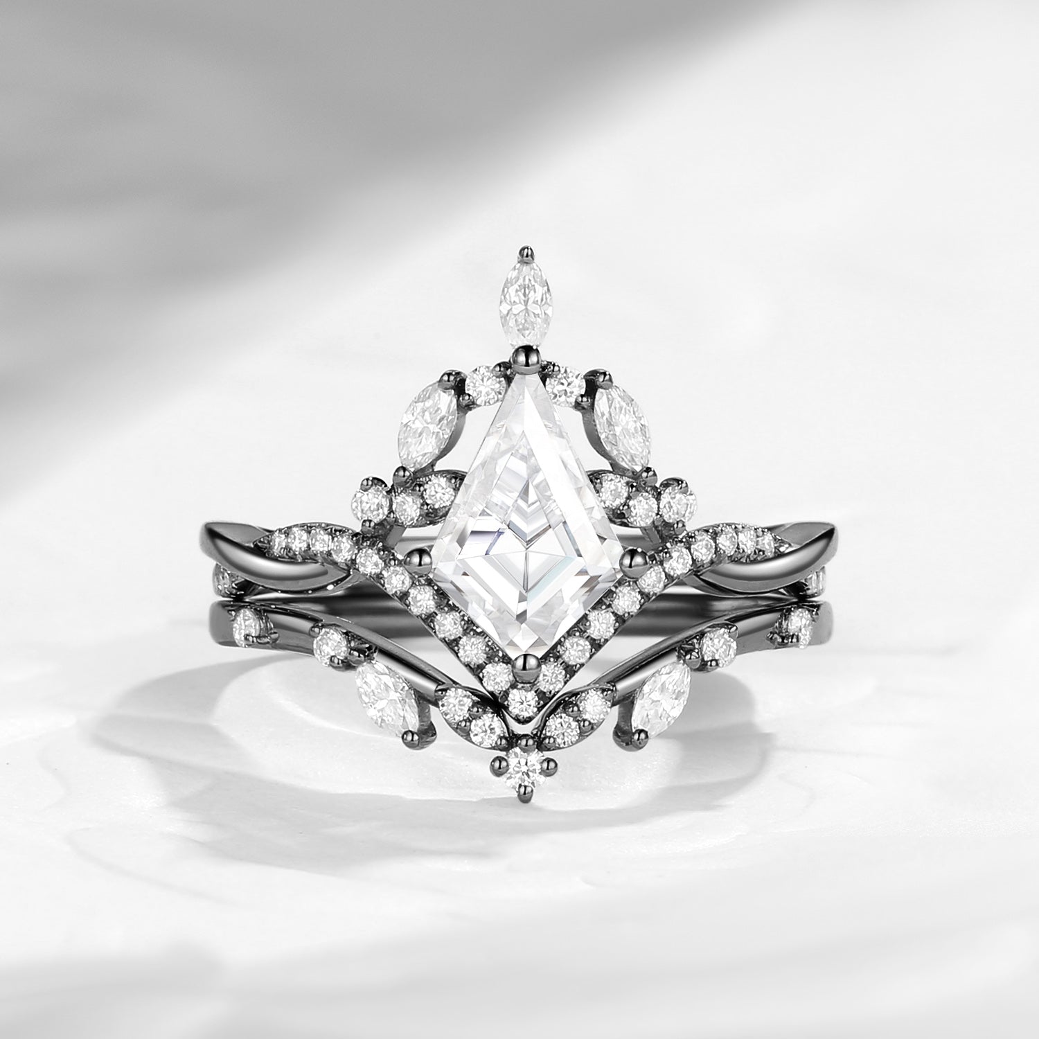 At its center rests a stunning kite-cut moissanite, defined by clean geometry and radiant brilliance. Its elongated facets catch the light from every angle, creating a captivating play of sparkle, while surrounding marquise and round accent stones add layers of depth, balance, and visual harmony.