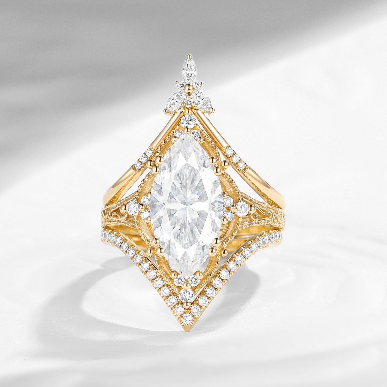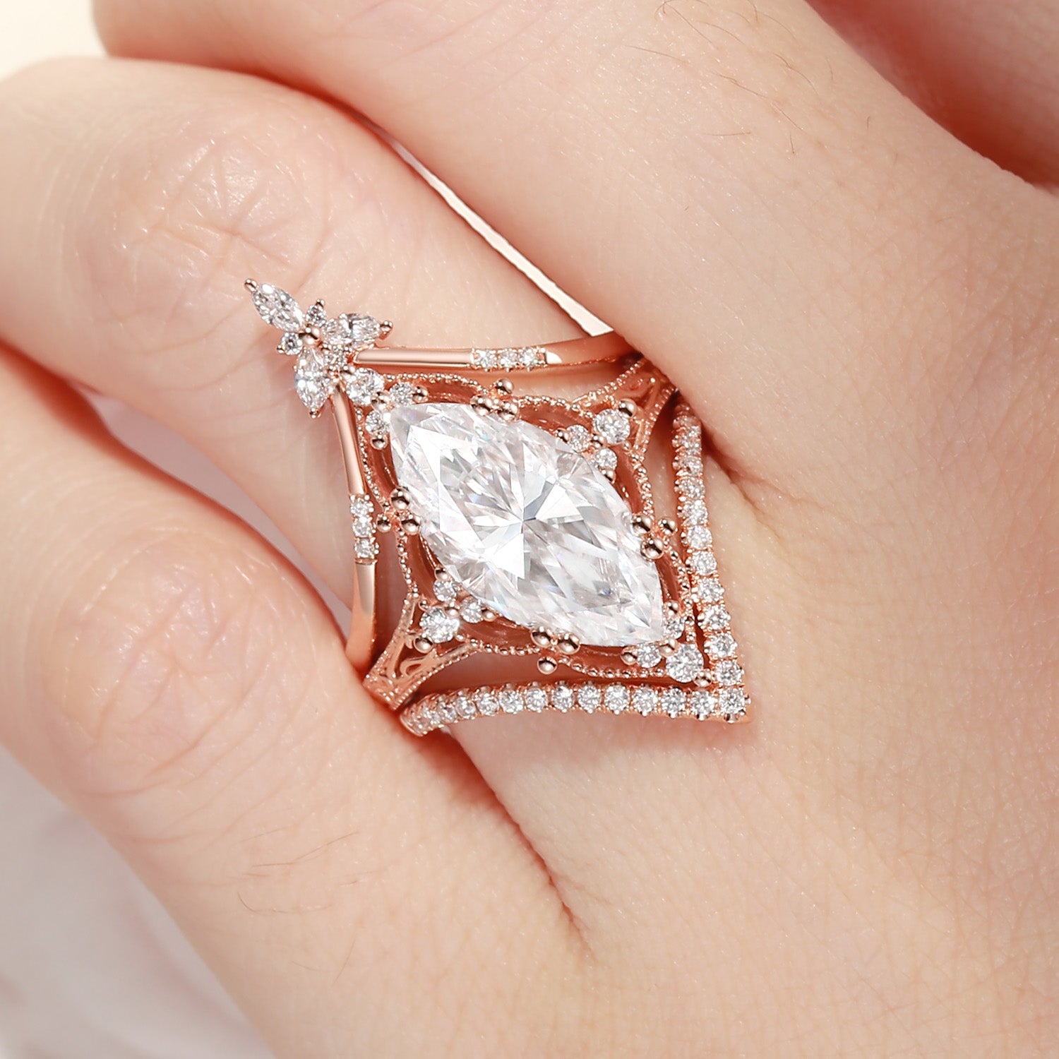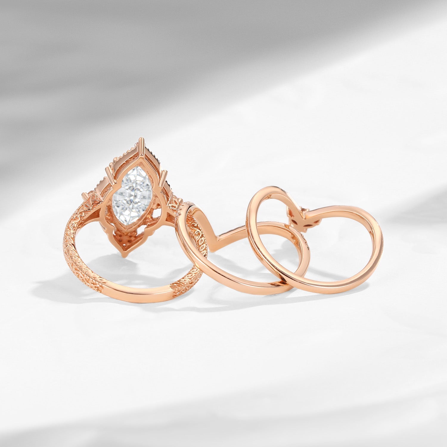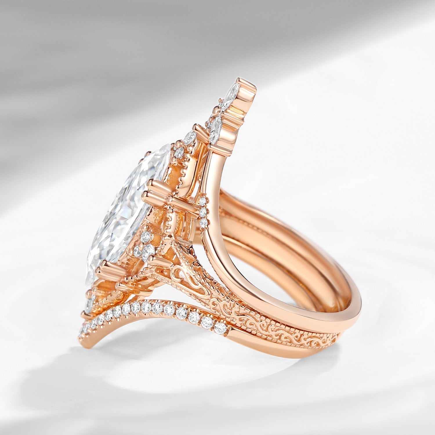 Vintage Inspired Marquise Cut Moissanite Engagement Ring Set 3pcs