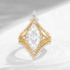 At its center lies a dazzling marquise-cut moissanite, admired for its elongated silhouette and exceptional fire. The center stone is framed by meticulously set colorless moissanite and diamond accents, enhancing its brilliance while adding depth, symmetry, and timeless sophistication.