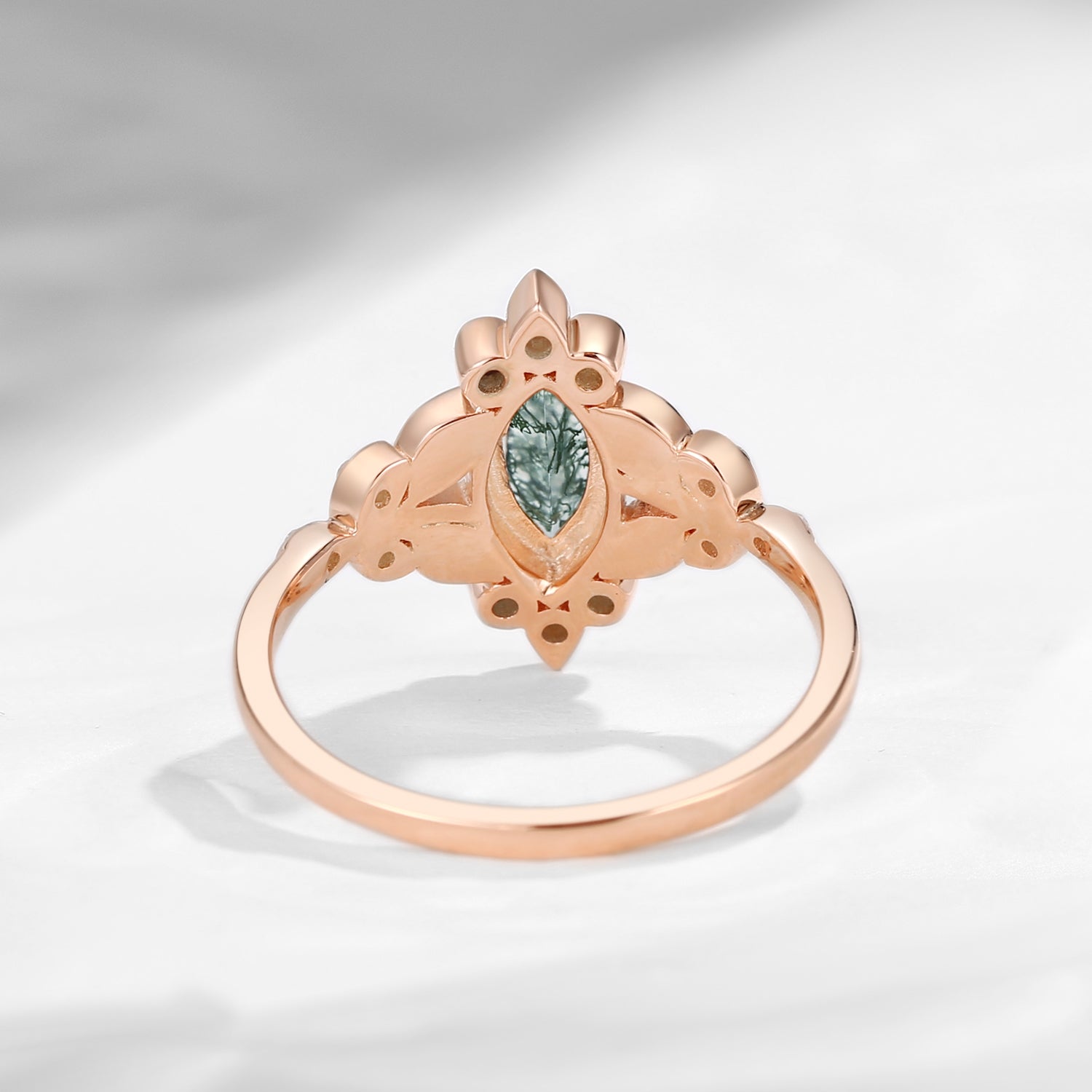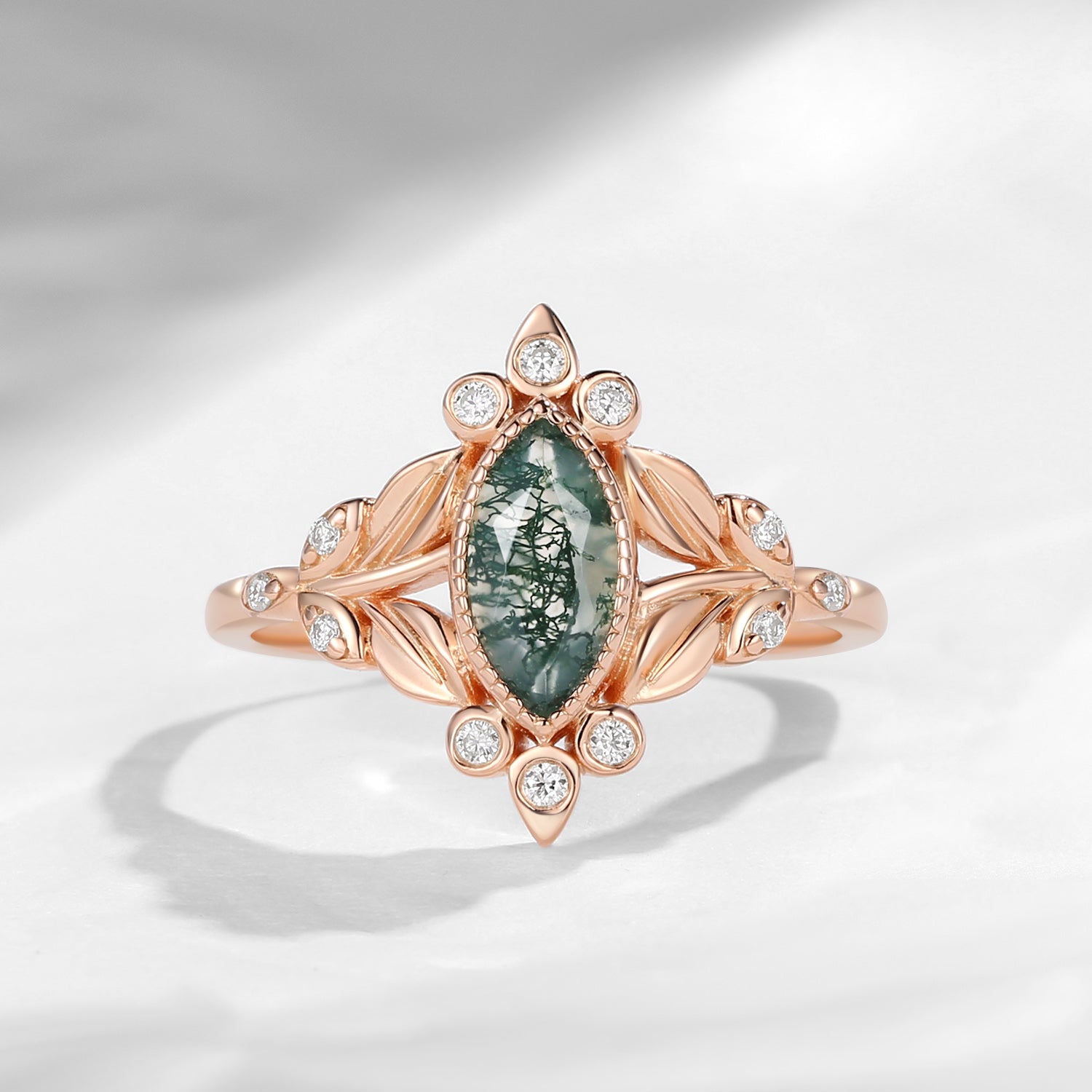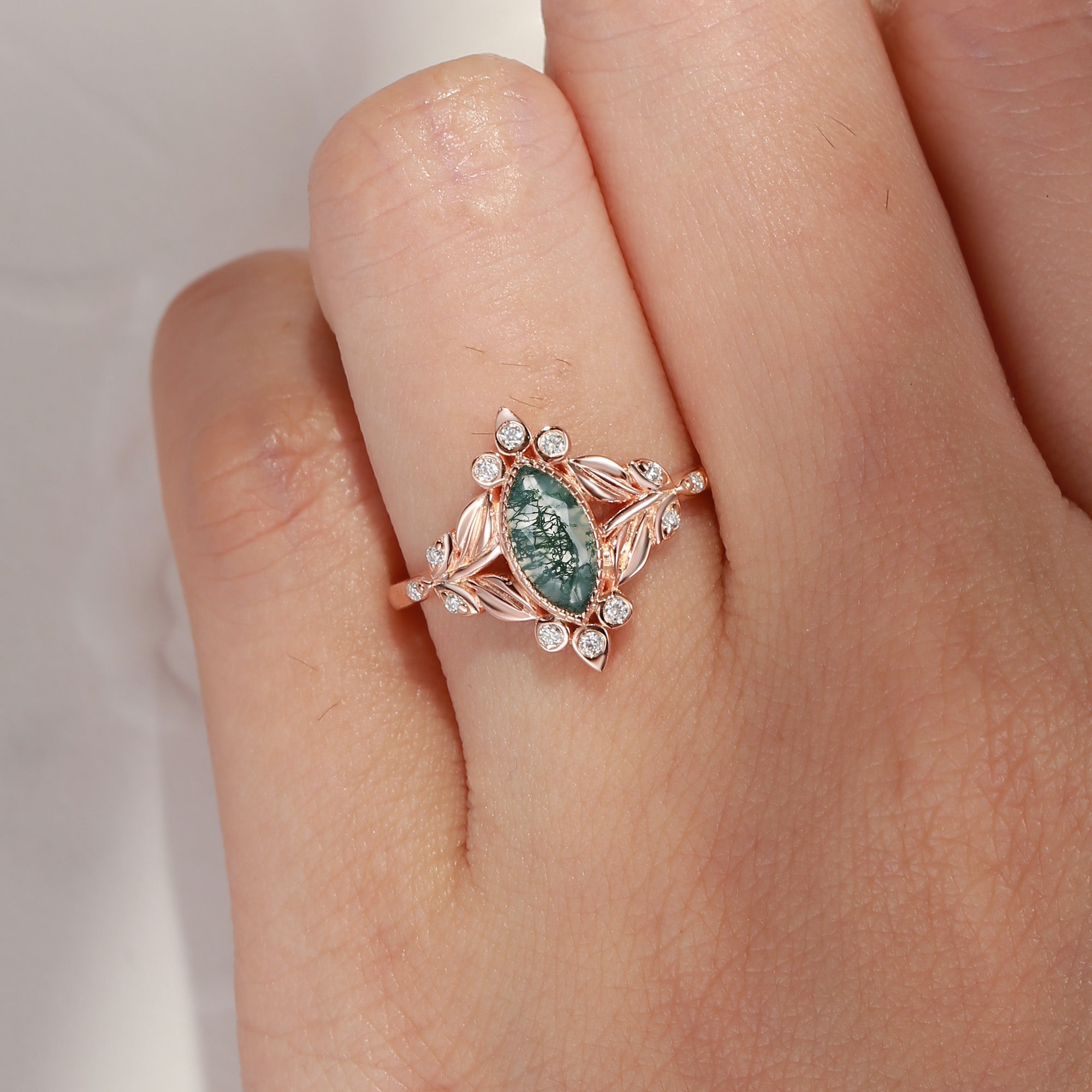 Unique Bezel Marquise Moss Agate Nature Inspired Engagement Ring