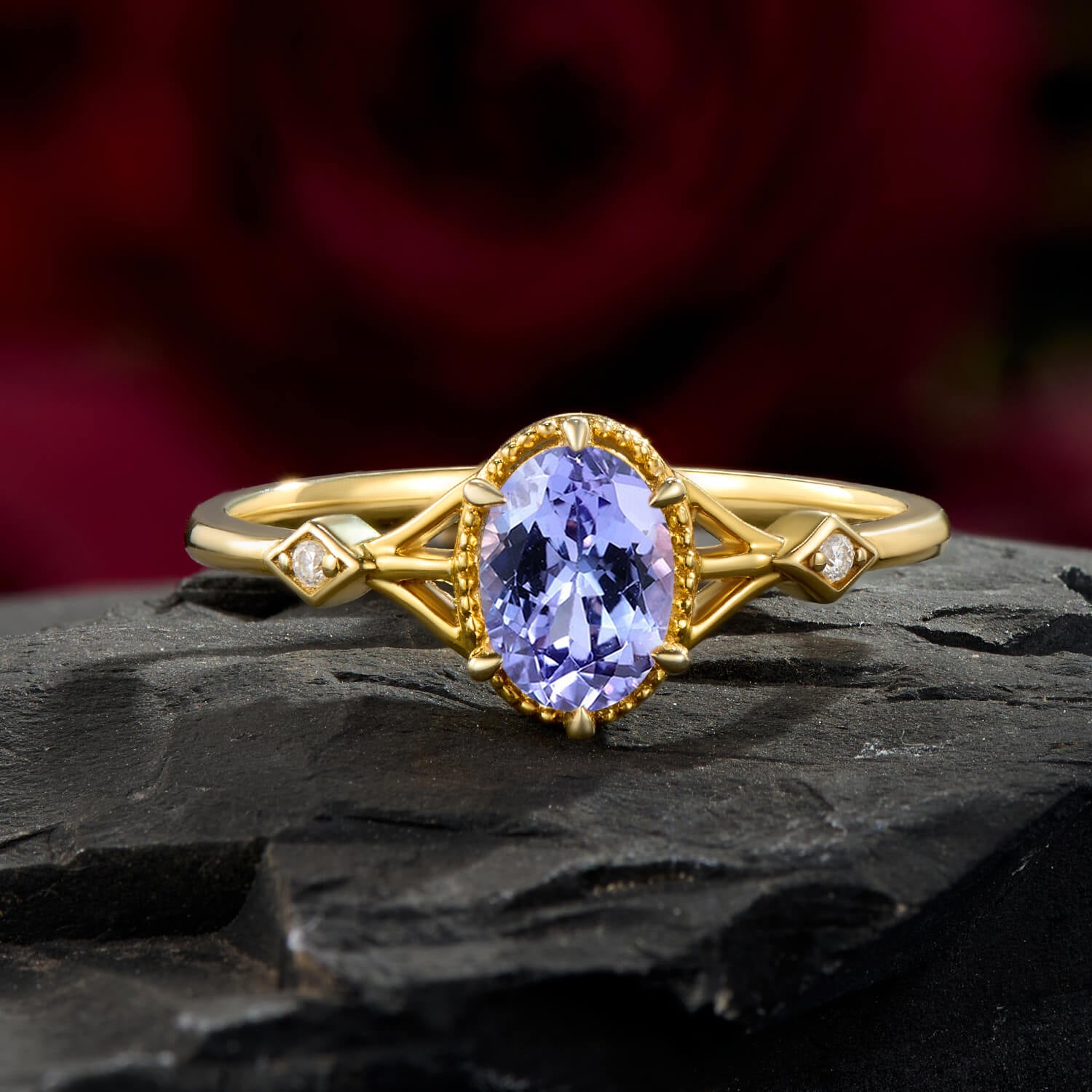 Regal Violet Glow Oval Cut Tanzanite Ring Gold Six-Prong Symmetrical Style Statement Engagement Ring