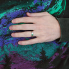 At its center rests a vivid green Emerald-cut simulated emerald, radiating a lush, nature-inspired glow that symbolizes growth, renewal, and harmony. The hand-hammered and brushed texture creates a raw yet refined surface, reflecting the strength and individuality of your bond.