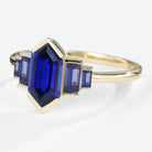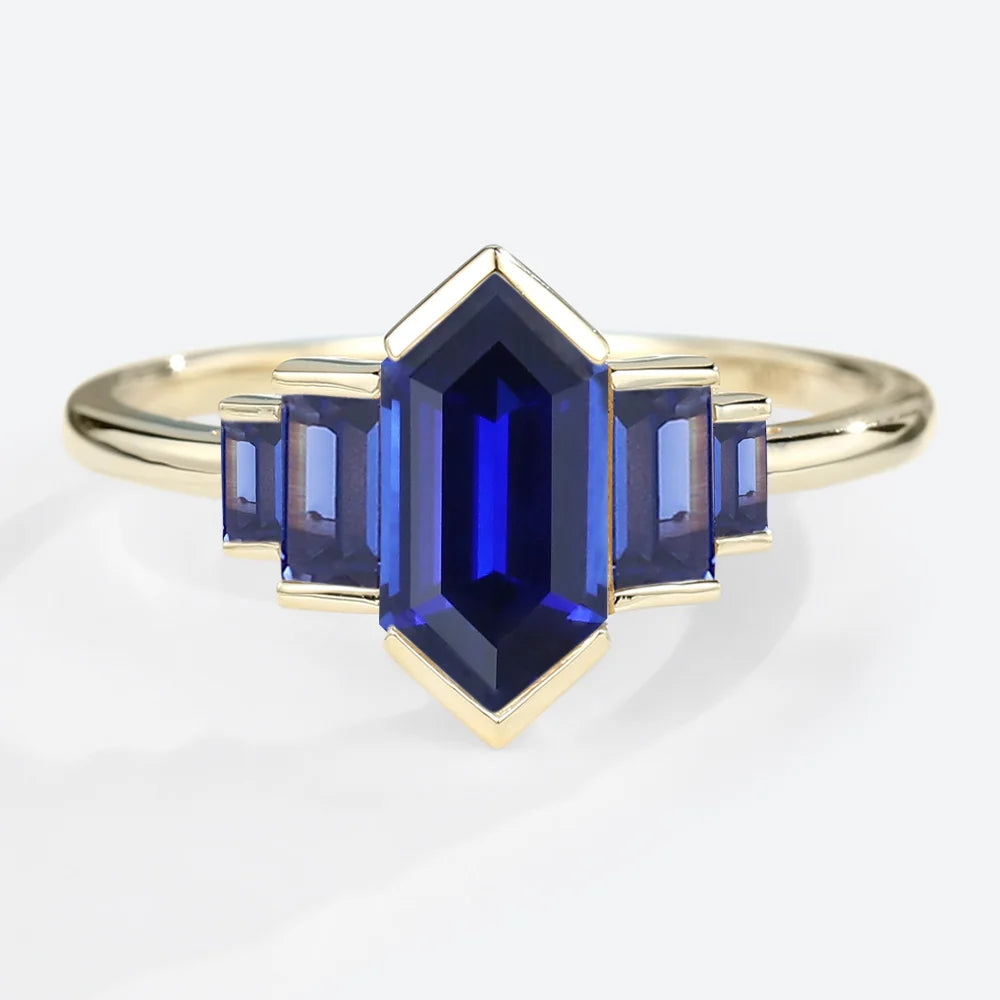 Long Hexagon Cut Lab Sapphire Unique Engagement Ring Baguette Accented Bridal Ring