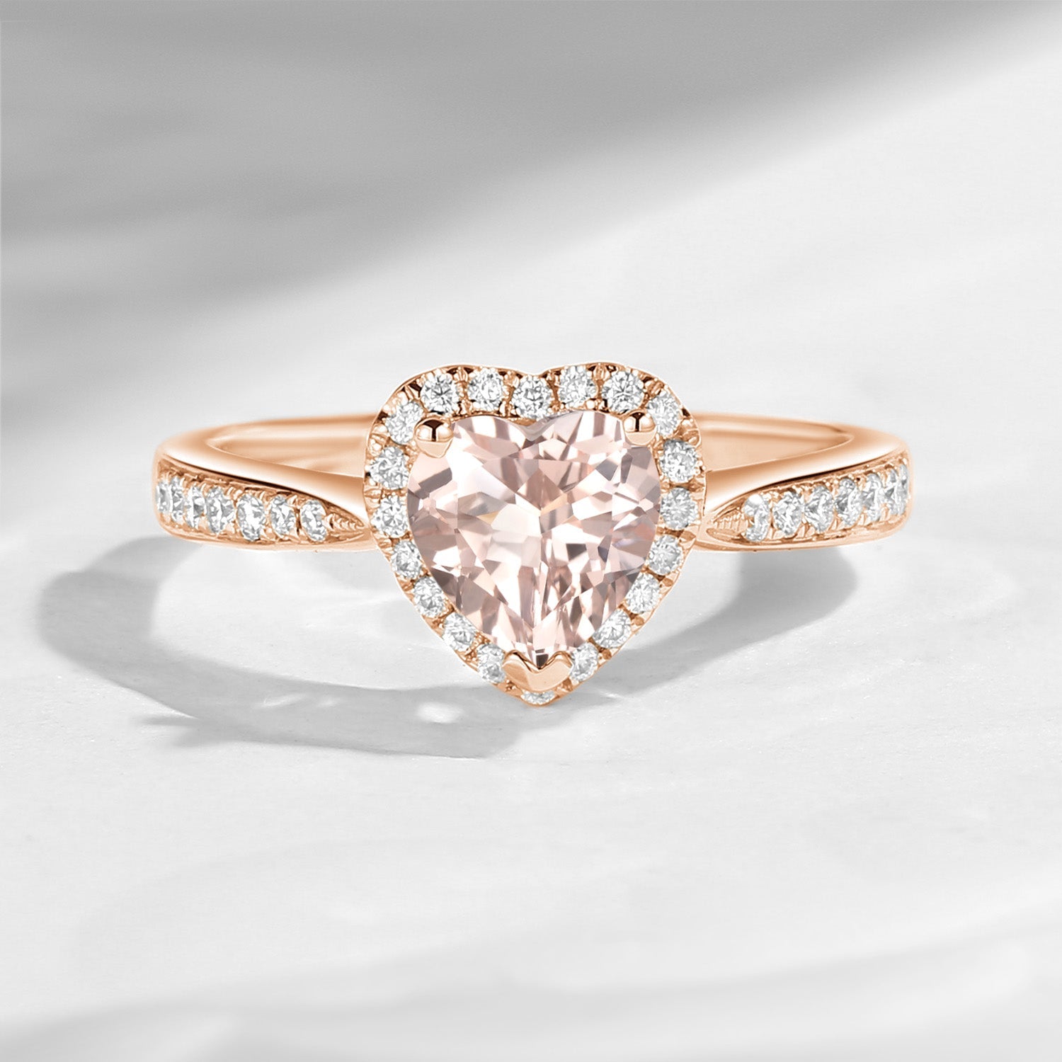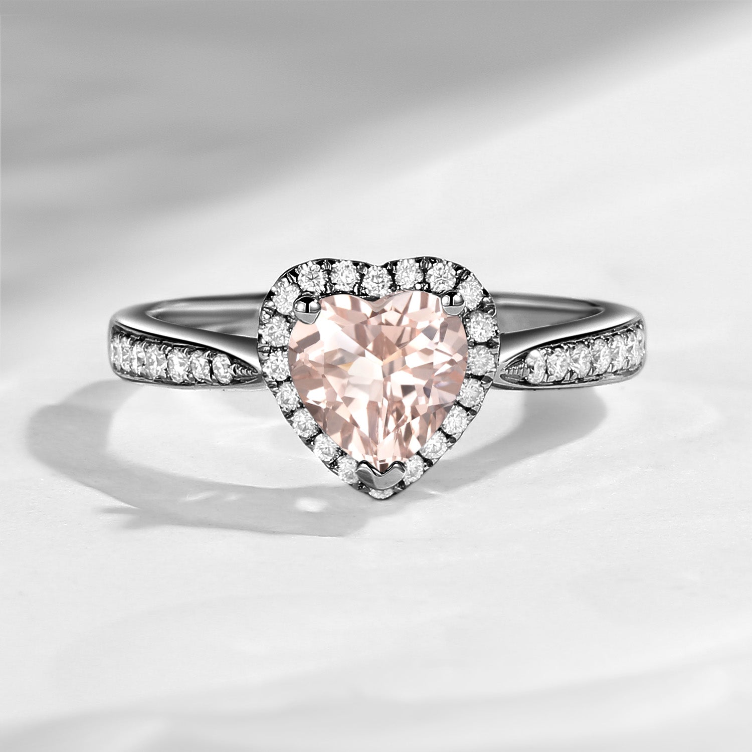 At the center features a heart shaped morganite,showcasing gentle blush tones and a refined brilliance. The heart cut enhances the stone’s natural warmth, while the surrounding halo adds extra sparkle and visual depth.