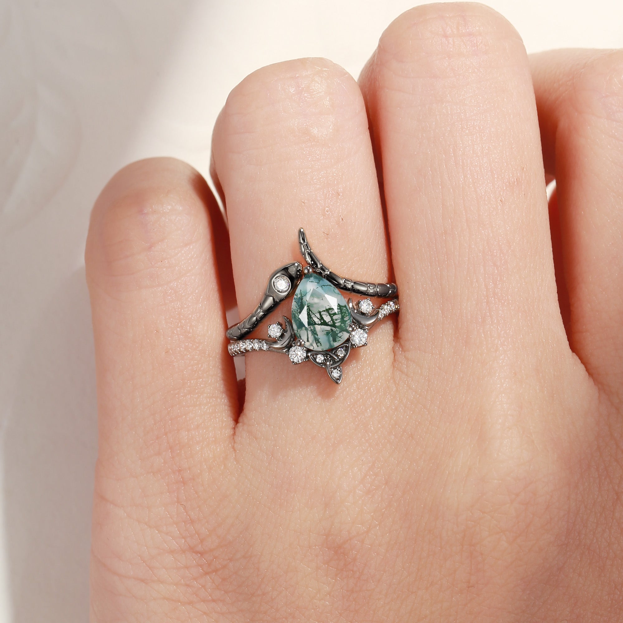 Celtic Moon | Pear Cut Moss Agate Gothic Inspired Snake Engagement Ring Set 2pcs