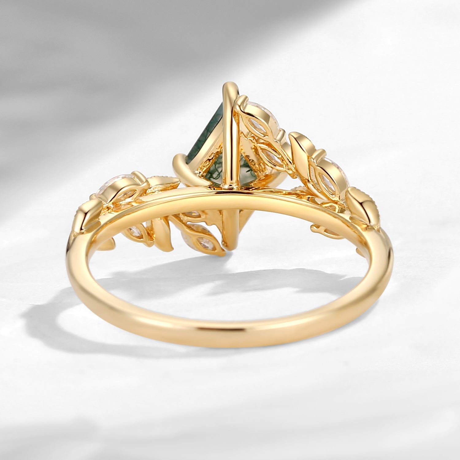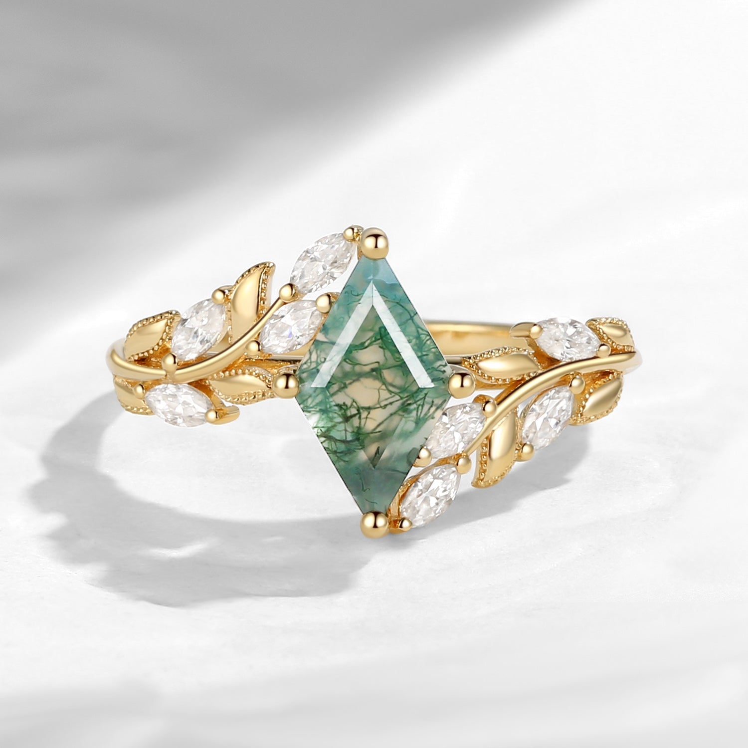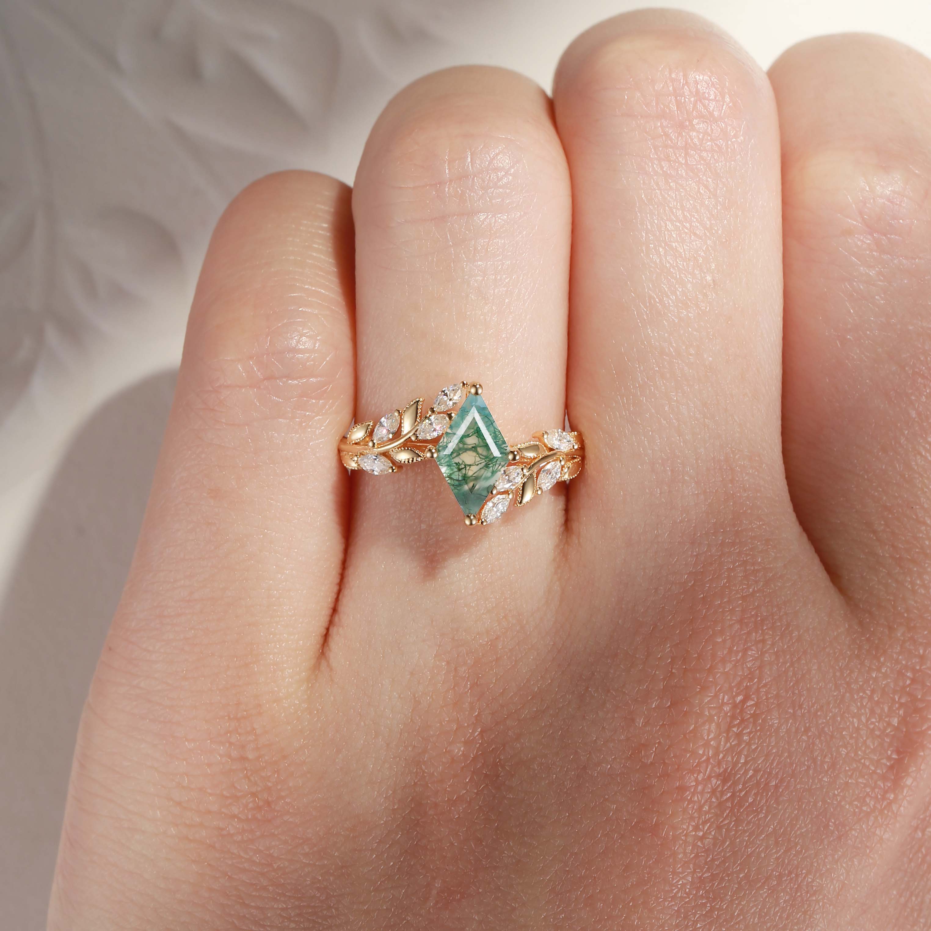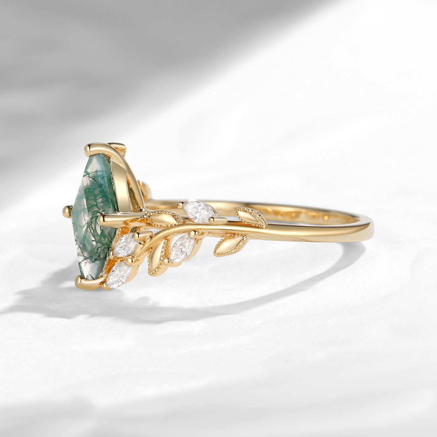 Unique Nature Inspired Kite Cut Moss Agate Leaf Engagement Ring