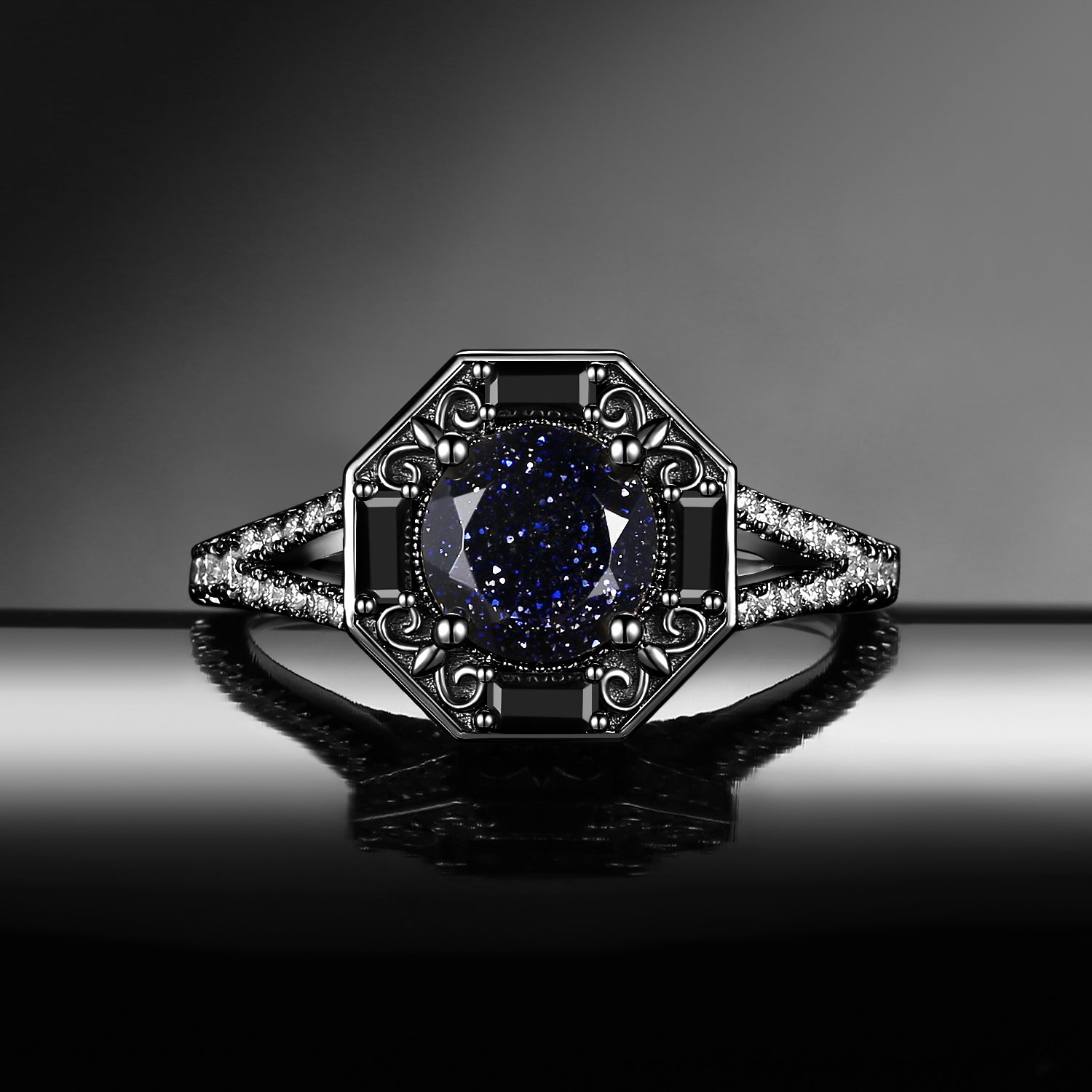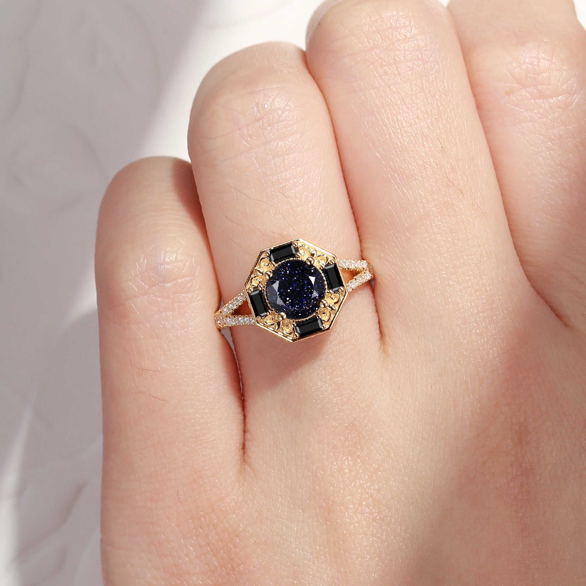 Round Cut Blue Sandstone 'Fallen Aegis' Filigree Gold Engagement Ring