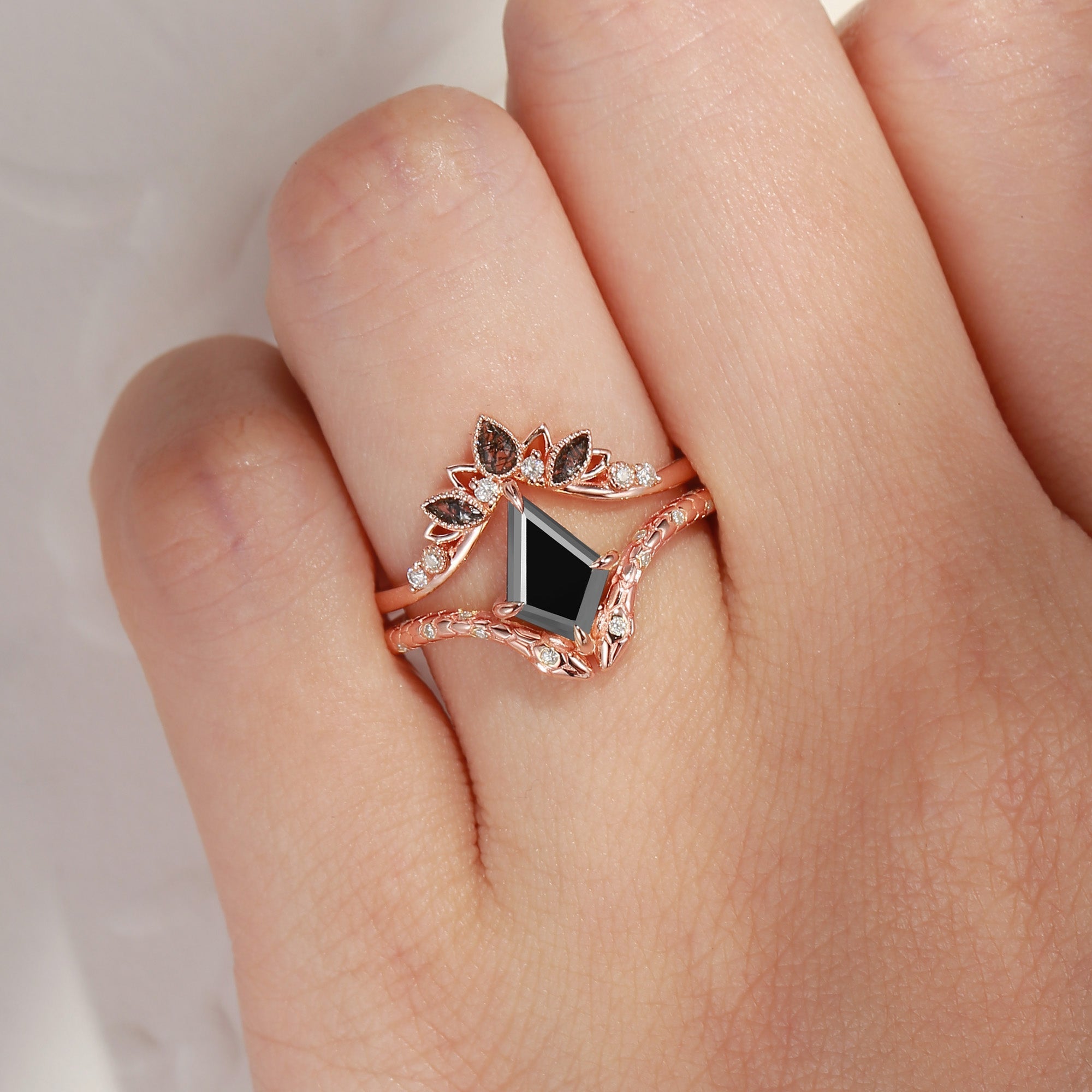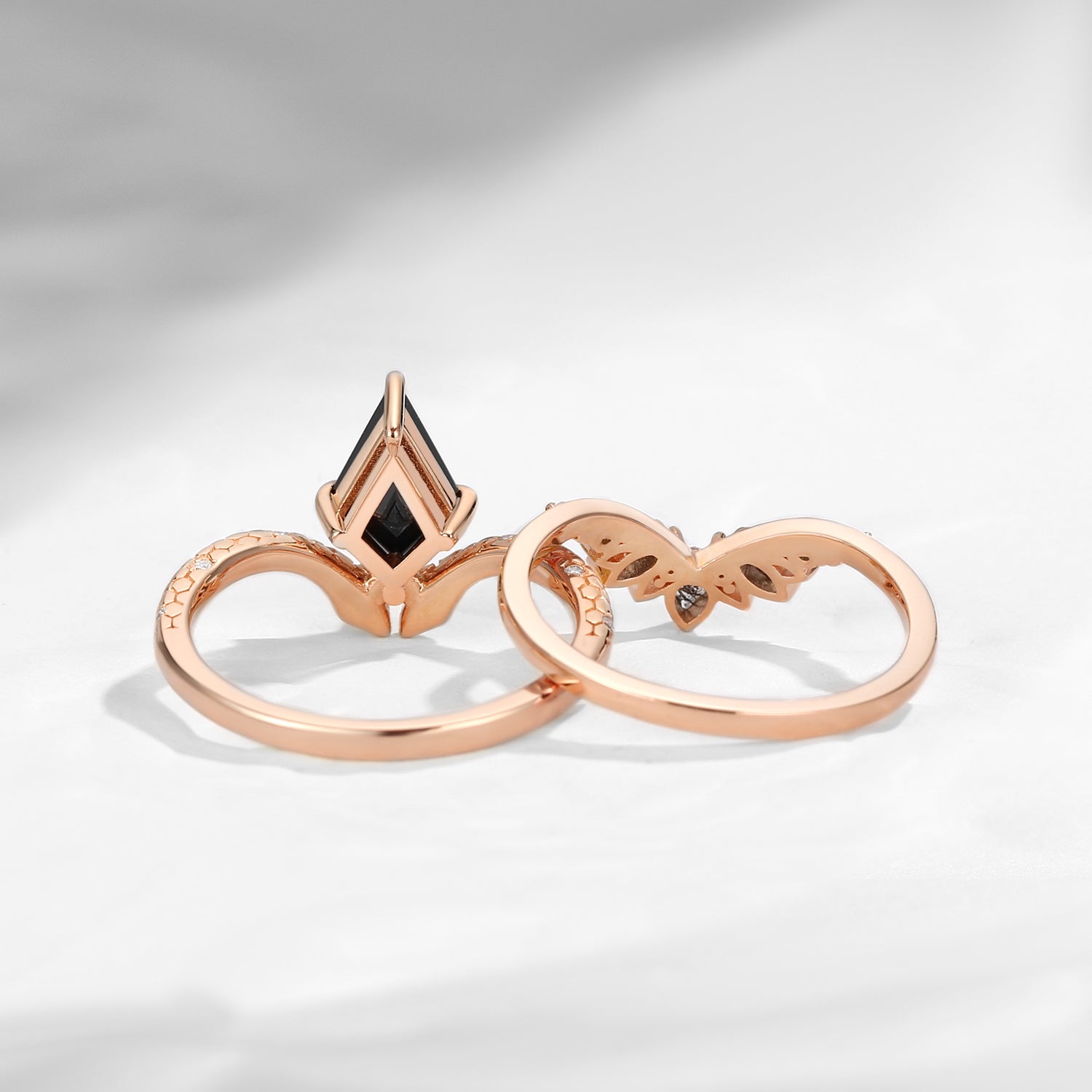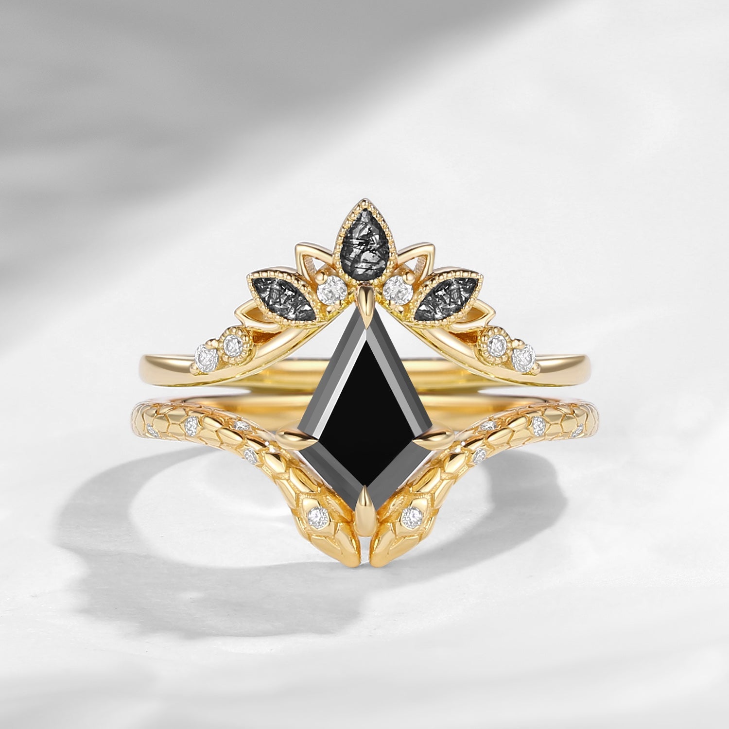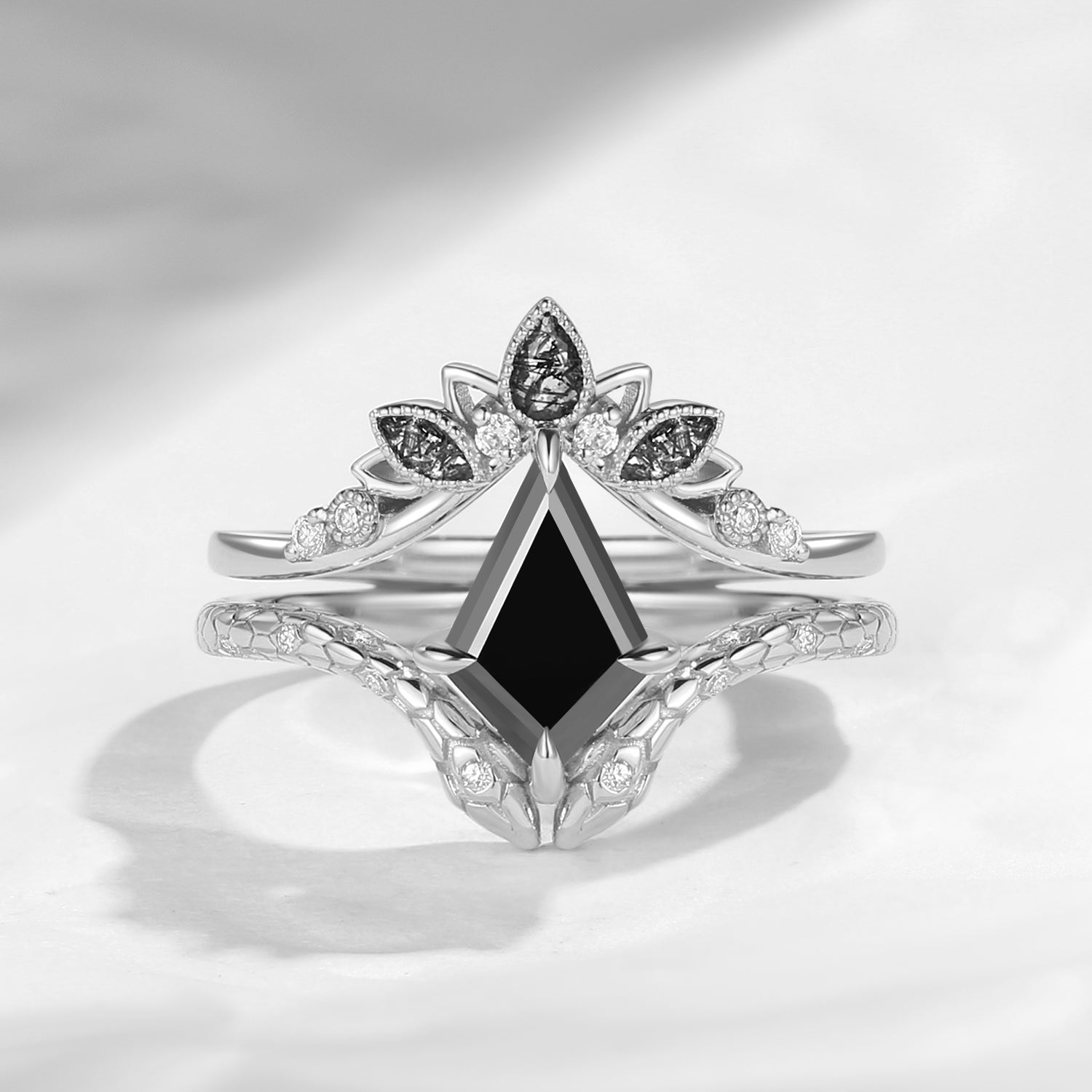 Gothic Kite Cut Black Moissanite Engagement Ring Set 2pcs - Serpent's Embrace
