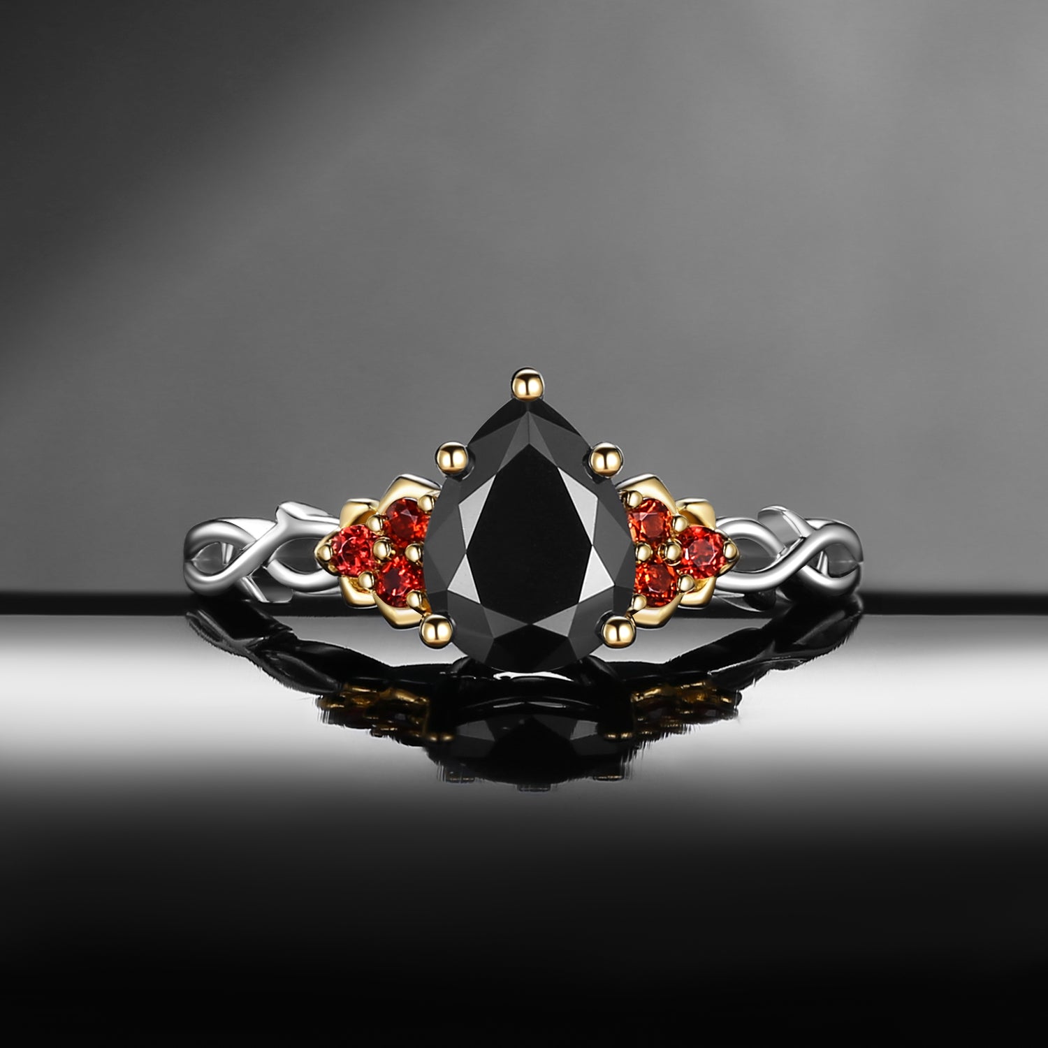 Nature Inspired Pear Shaped Black Moissanite 'Thorns & Roses' Two-Toned Engagement Ring