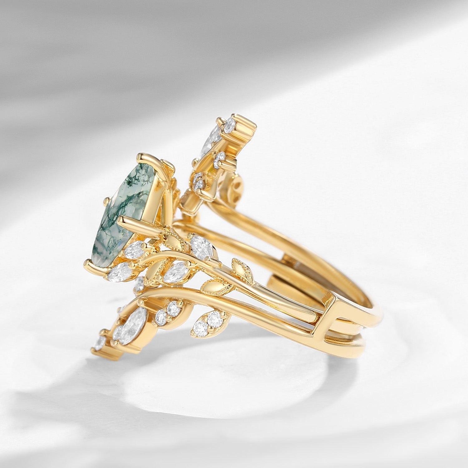 Unique Nature Inspired Kite Cut Moss Agate Leaf Engagement Ring Set 2pcs