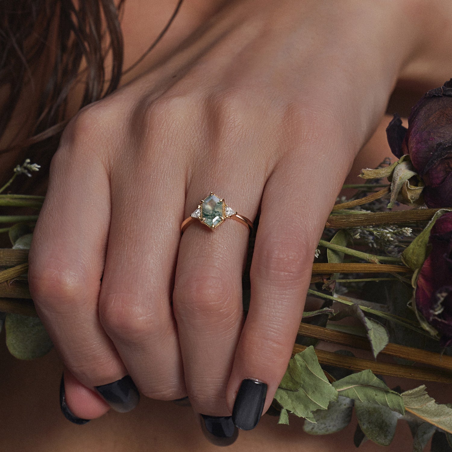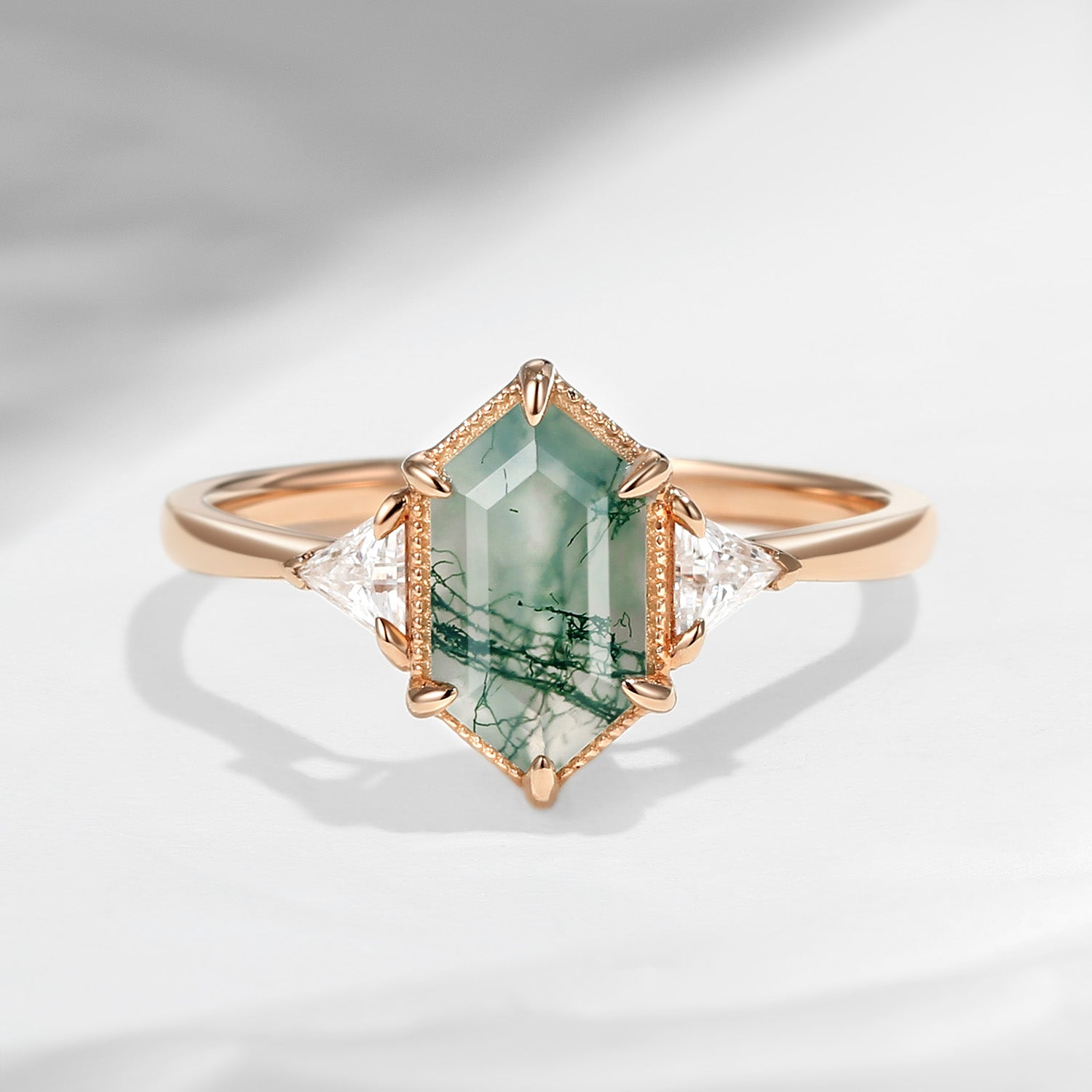 Nature cut Long Hexagon Moss Agate Ring in 14K Rose Gold Garden Style Engagement Ring Set 2pcs