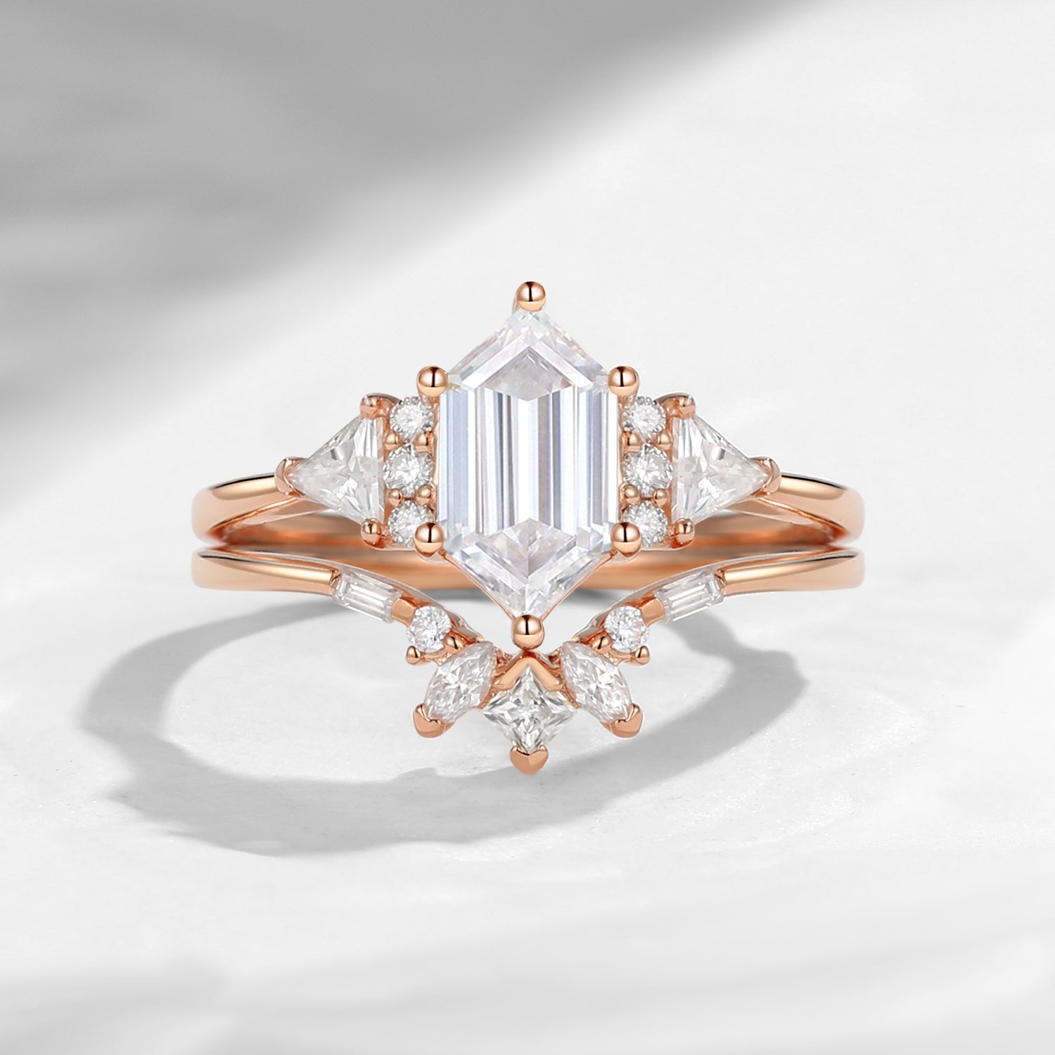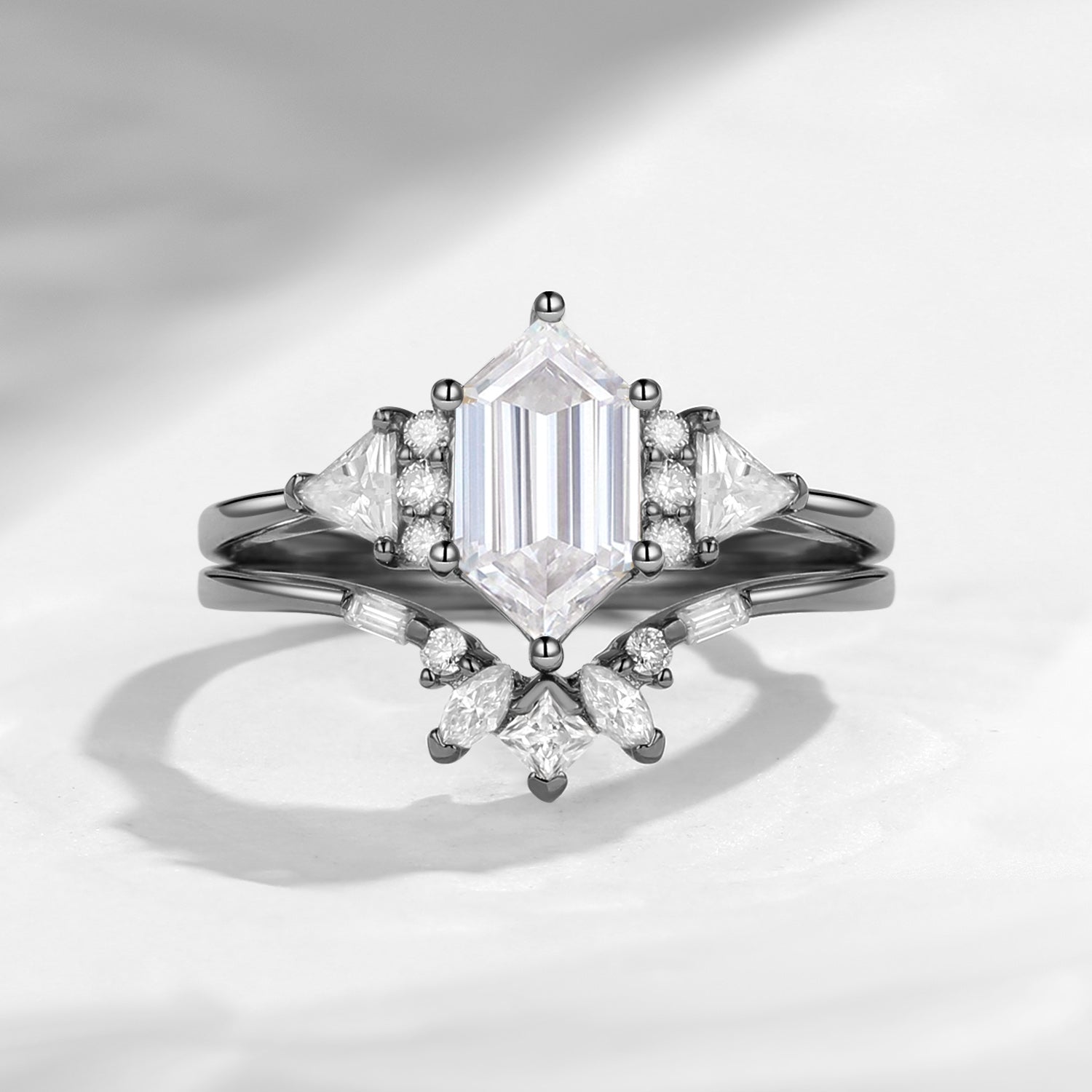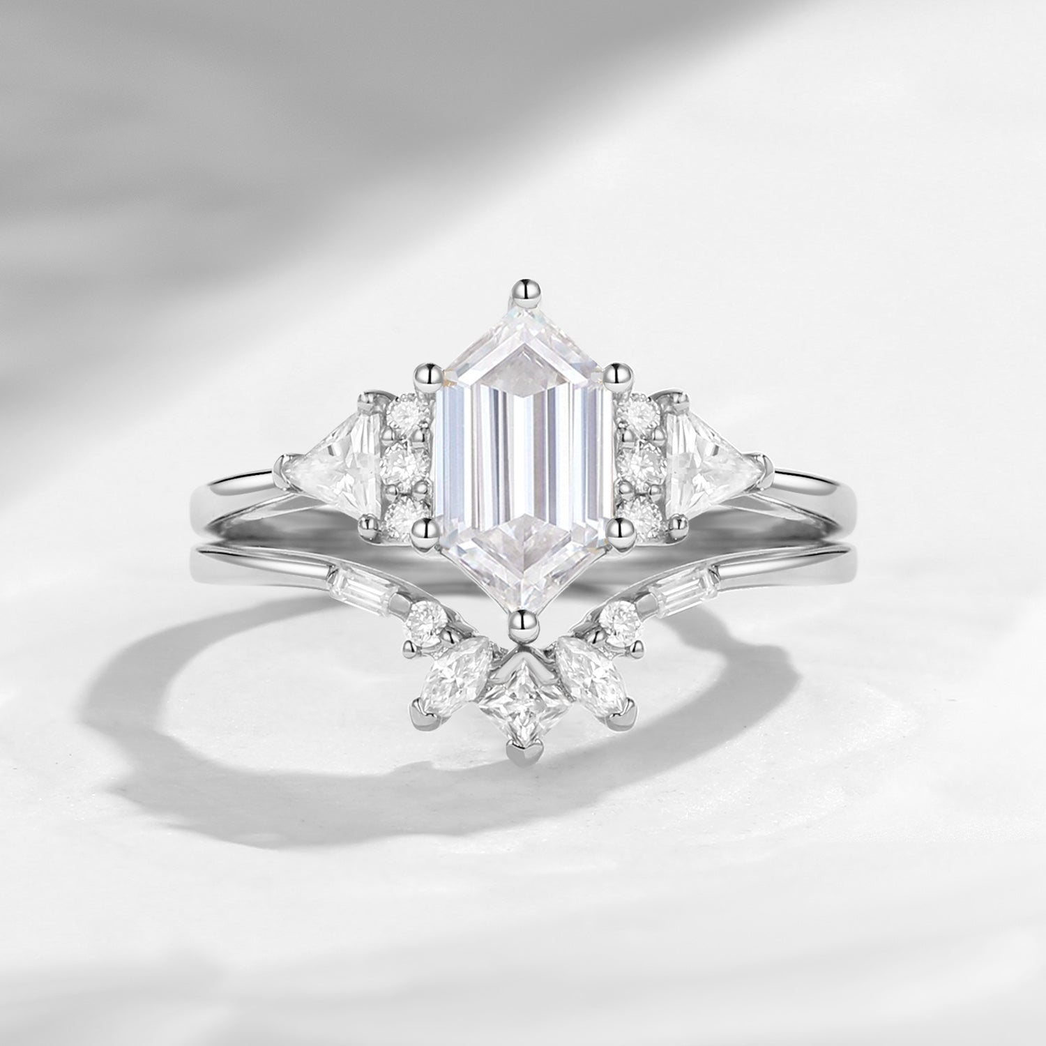 Classic Cluster Long Hexagon Cut Moissanite Engagement Ring Set 2pcs
