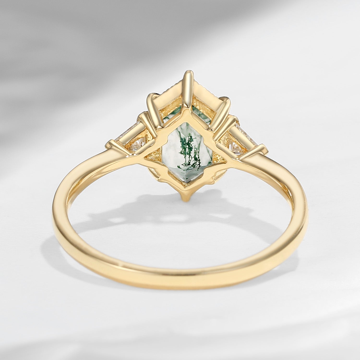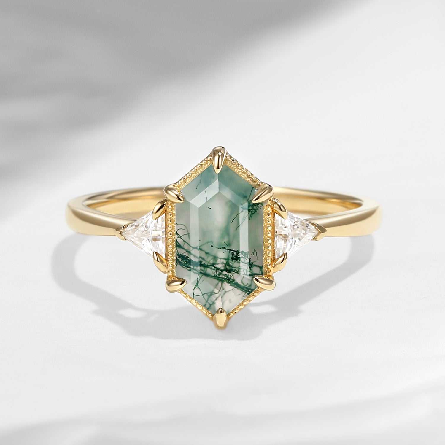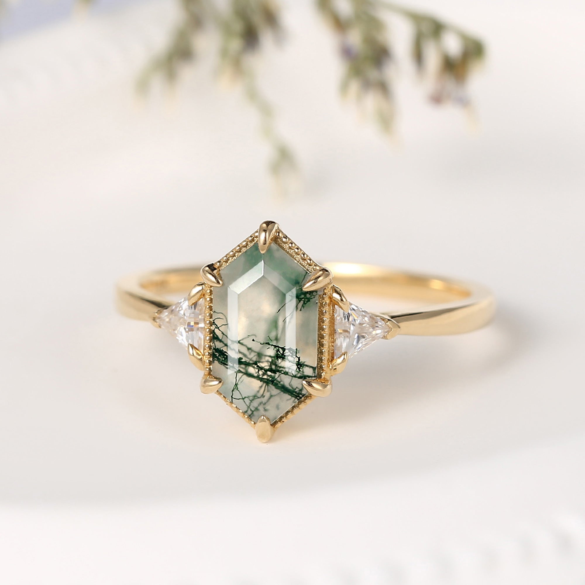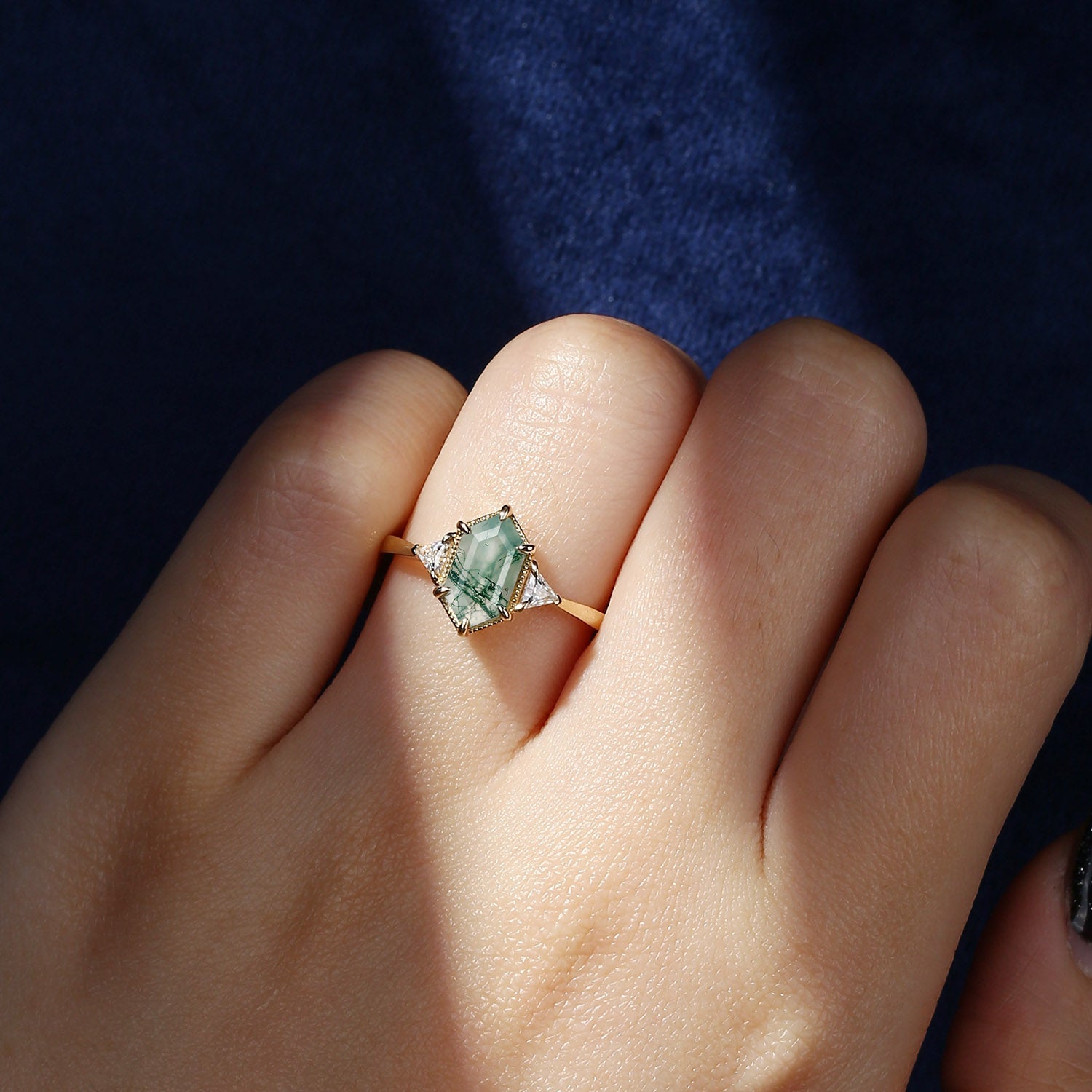 Vintage Long Hexagon Moss Agate Engagement Ring