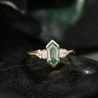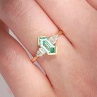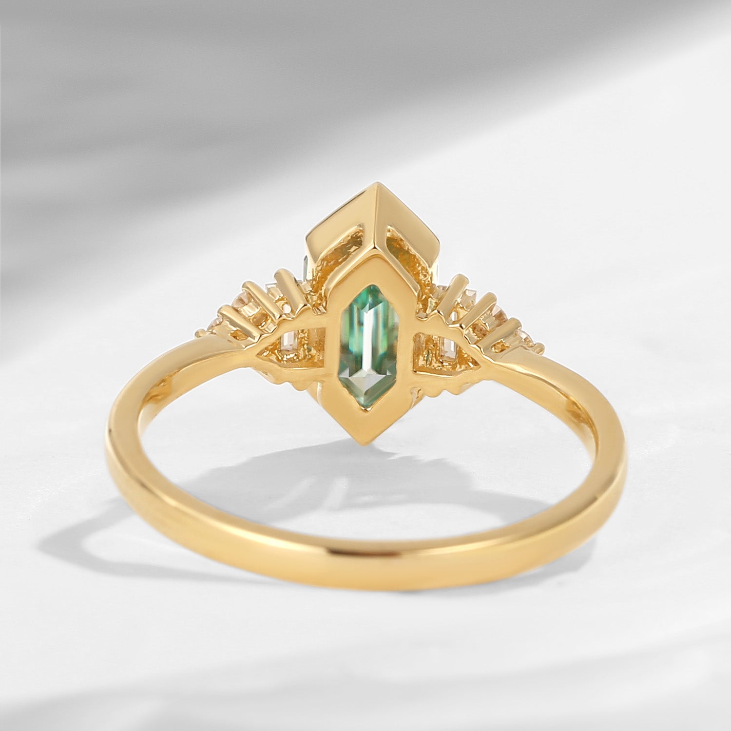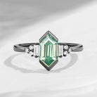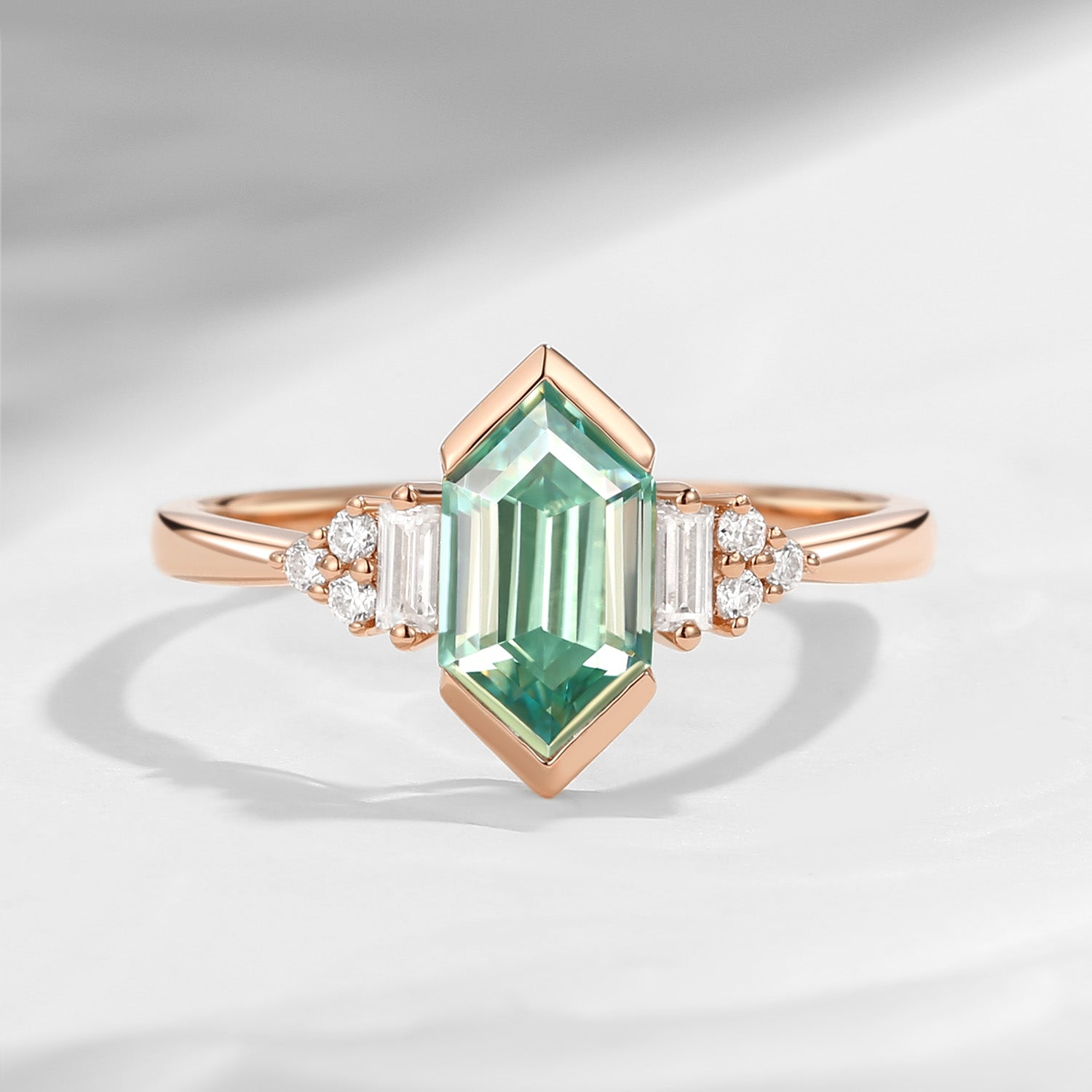 At its center features a striking mint green moissanite, showcasing crisp lines and a softly luminous glow. The elongated hexagon cut enhances finger length while allowing the stone’s clarity and sparkle to shine with understated sophistication.