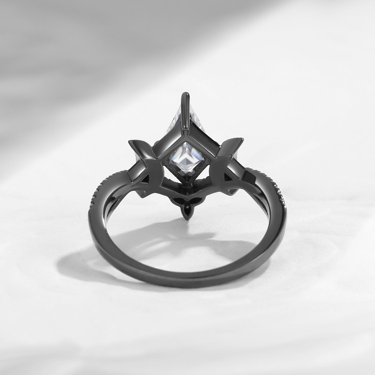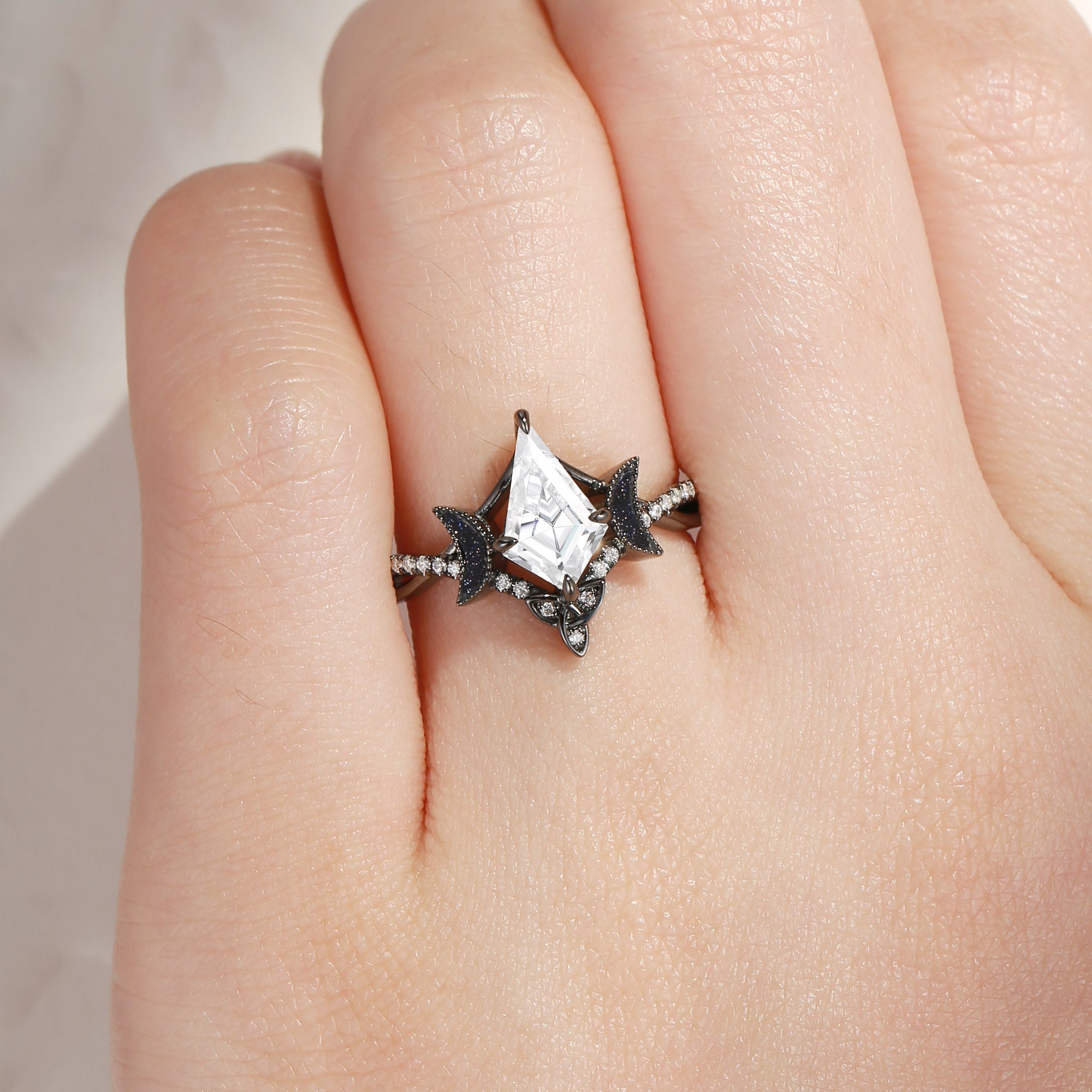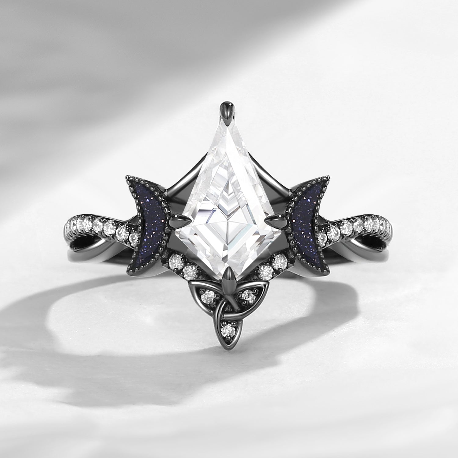 Mysterious and luminous, the Kite Cut Moissanite Twist Celtic Moon Black Gold Engagement Ring is a striking fusion of celestial symbolism and gothic elegance.