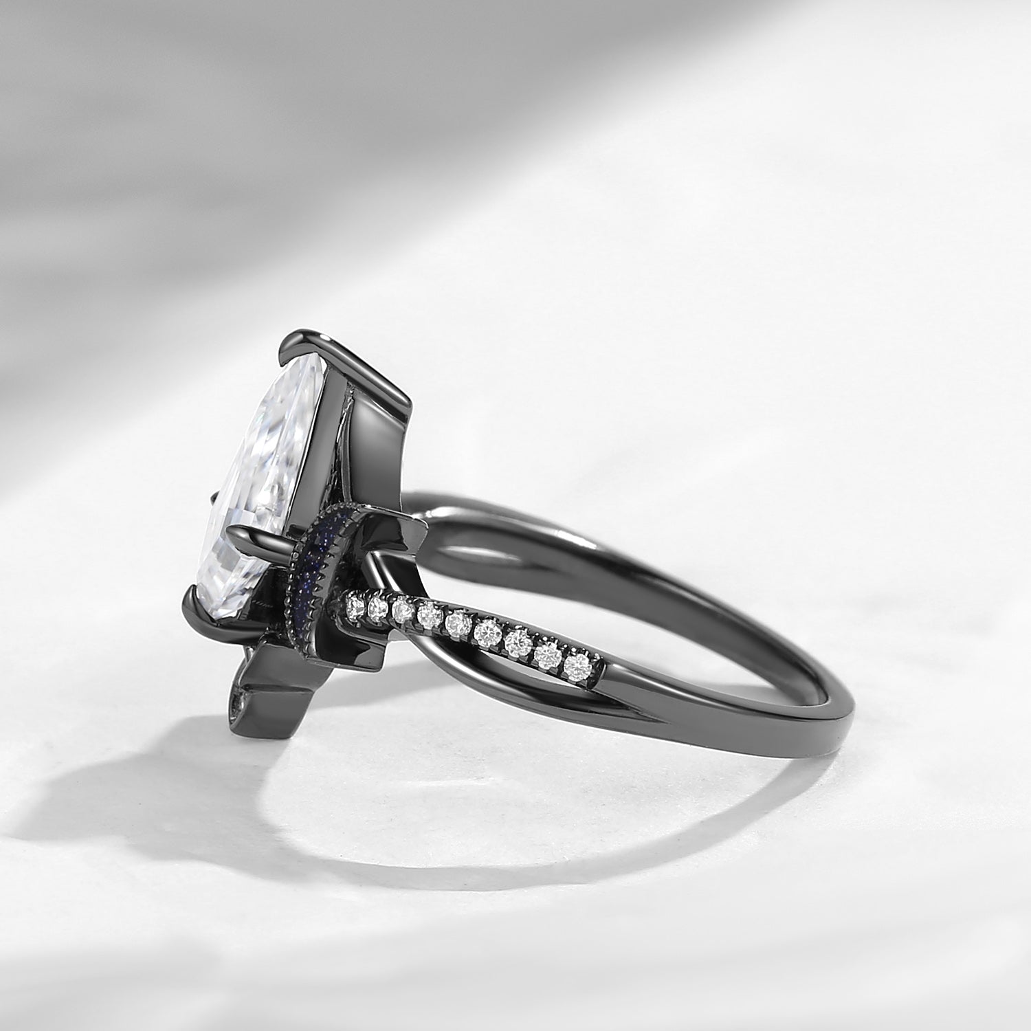 At its center, a brilliant kite-cut moissanite radiates icy fire and exceptional clarity, its elongated silhouette drawing the eye upward like a guiding star in the night sky.