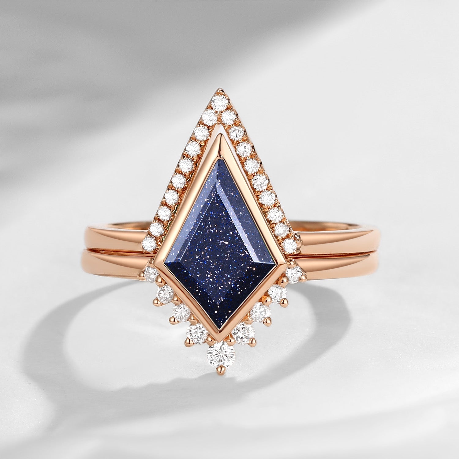 With its kite cut blue sandstone and shimmering accent stones, this ring captures the magic of a starry night in a clean, contemporary design—an elegant choice for those seeking a unique and symbolic piece.