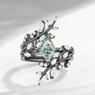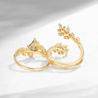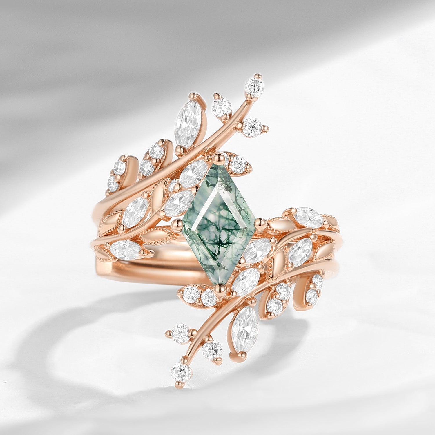 Unique Nature Inspired Kite Cut Moss Agate Leaf Engagement Ring Set 2pcs