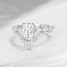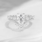 Flanking the center stone, marquise and round accent moissanites are thoughtfully arranged along the band, adding subtle sparkle and visual depth. The gently contoured pavé setting enhances brilliance without overpowering the centerpiece, creating a harmonious and elegant profile.