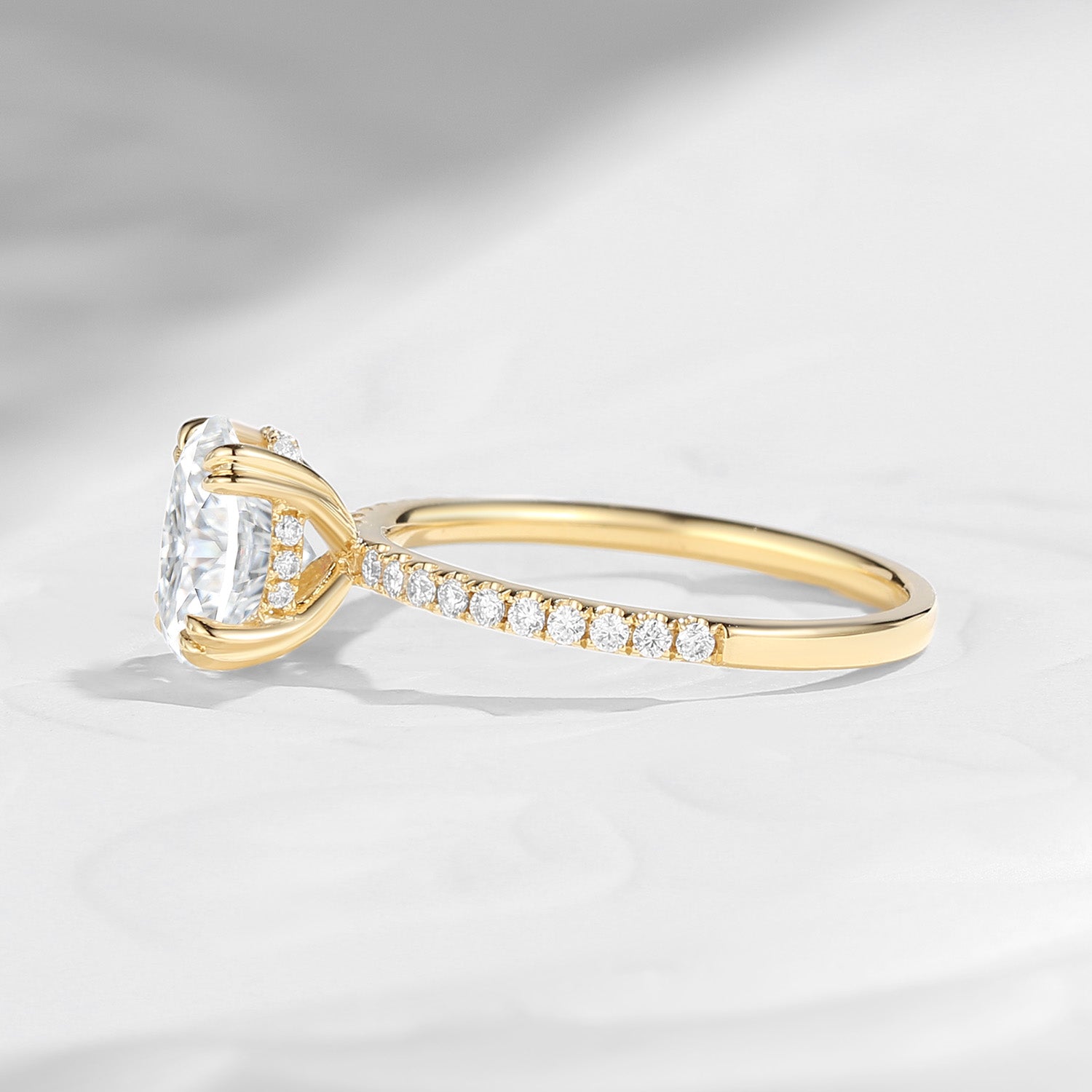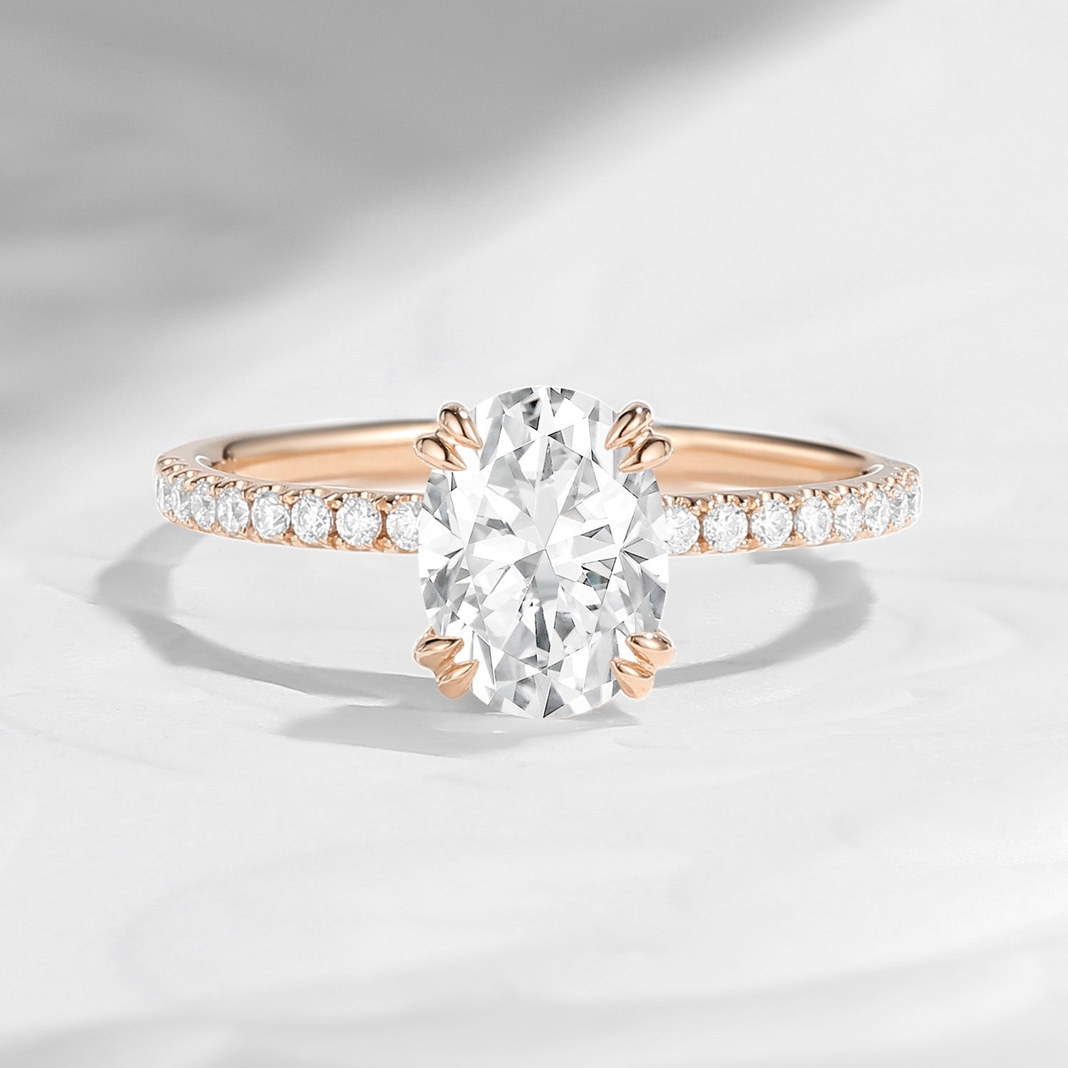The elongated oval silhouette enhances the stone’s brilliance while creating a graceful, flattering profile on the hand. A delicate pavé-set band of shimmering accent stones adds a subtle yet luxurious sparkle, perfectly complementing the center stone without overwhelming its brilliance.