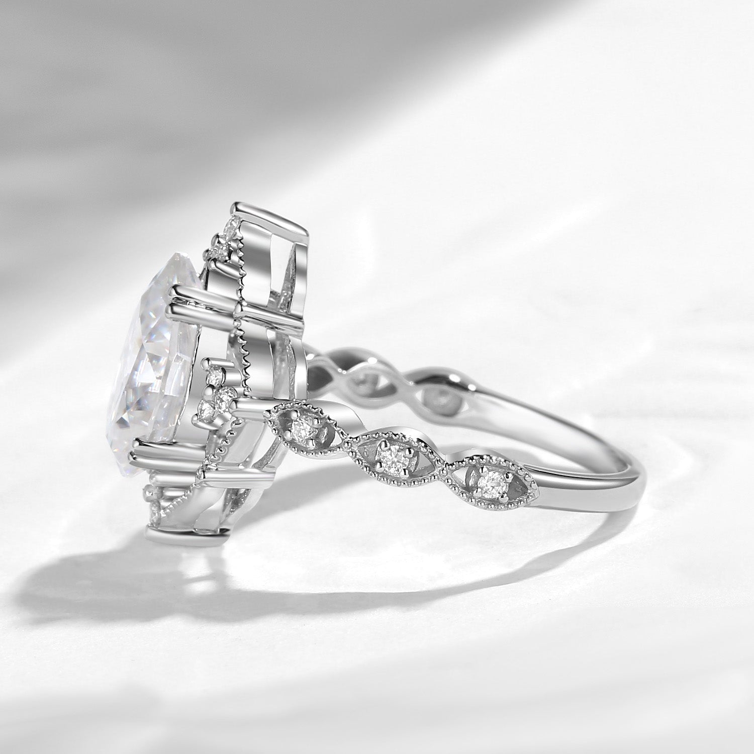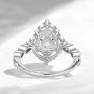 This Pear Shaped Moissanite Engagement Ring features an elegant antique-inspired design in a refined white gold tone, highlighted by a delicate floral halo that brings timeless romance and vintage charm together.