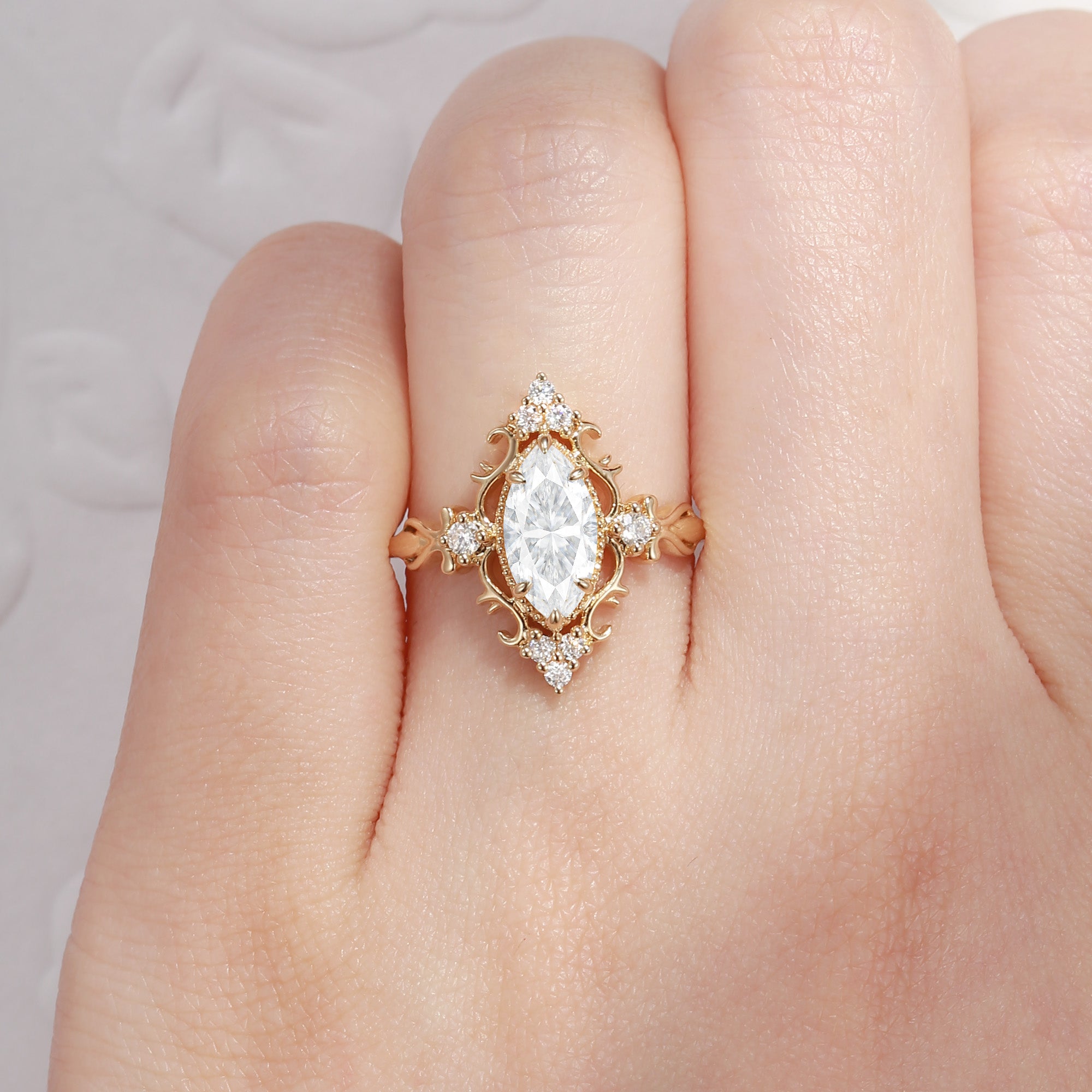 Embrace timeless elegance with this Marquise Cut Moissanite Vintage Filigree Ring, a refined design inspired by classical architecture and romantic artistry.