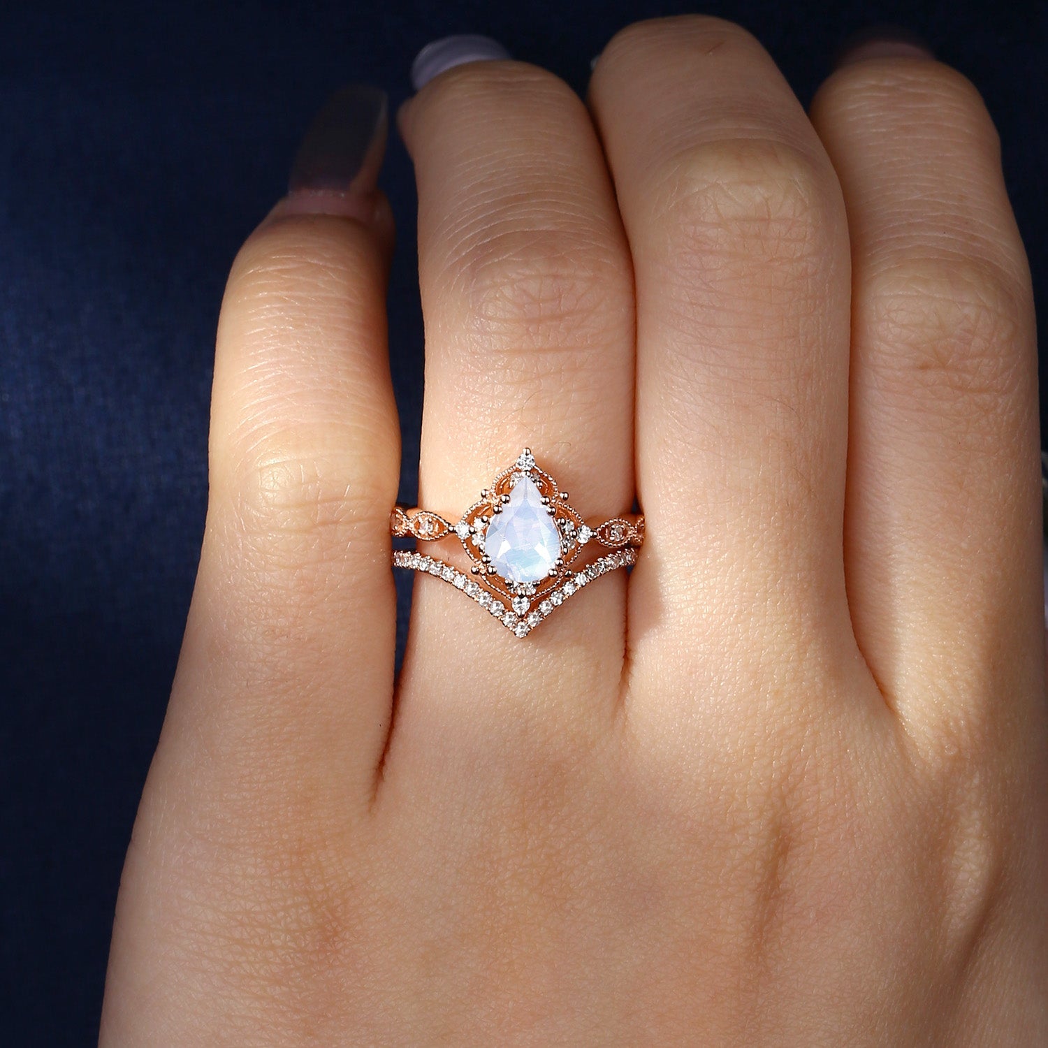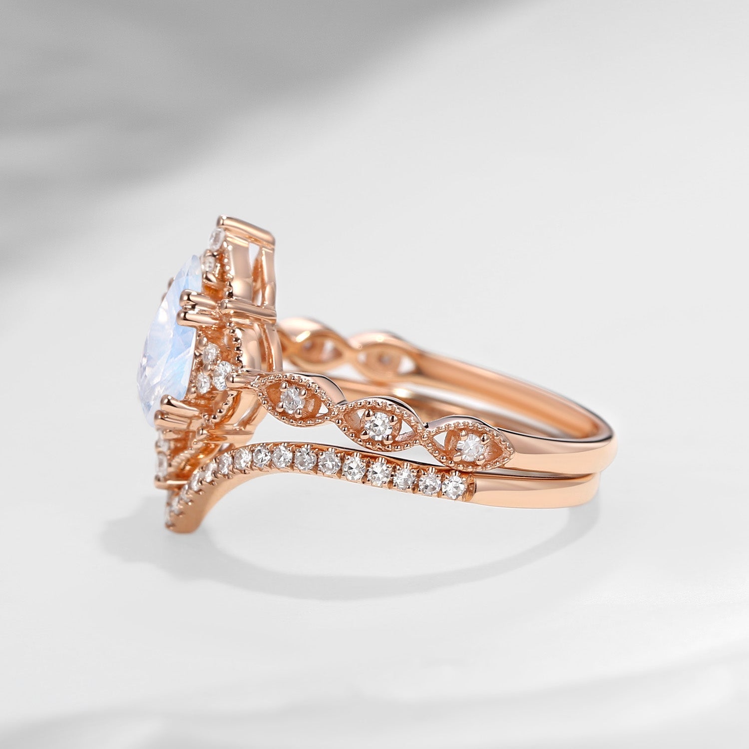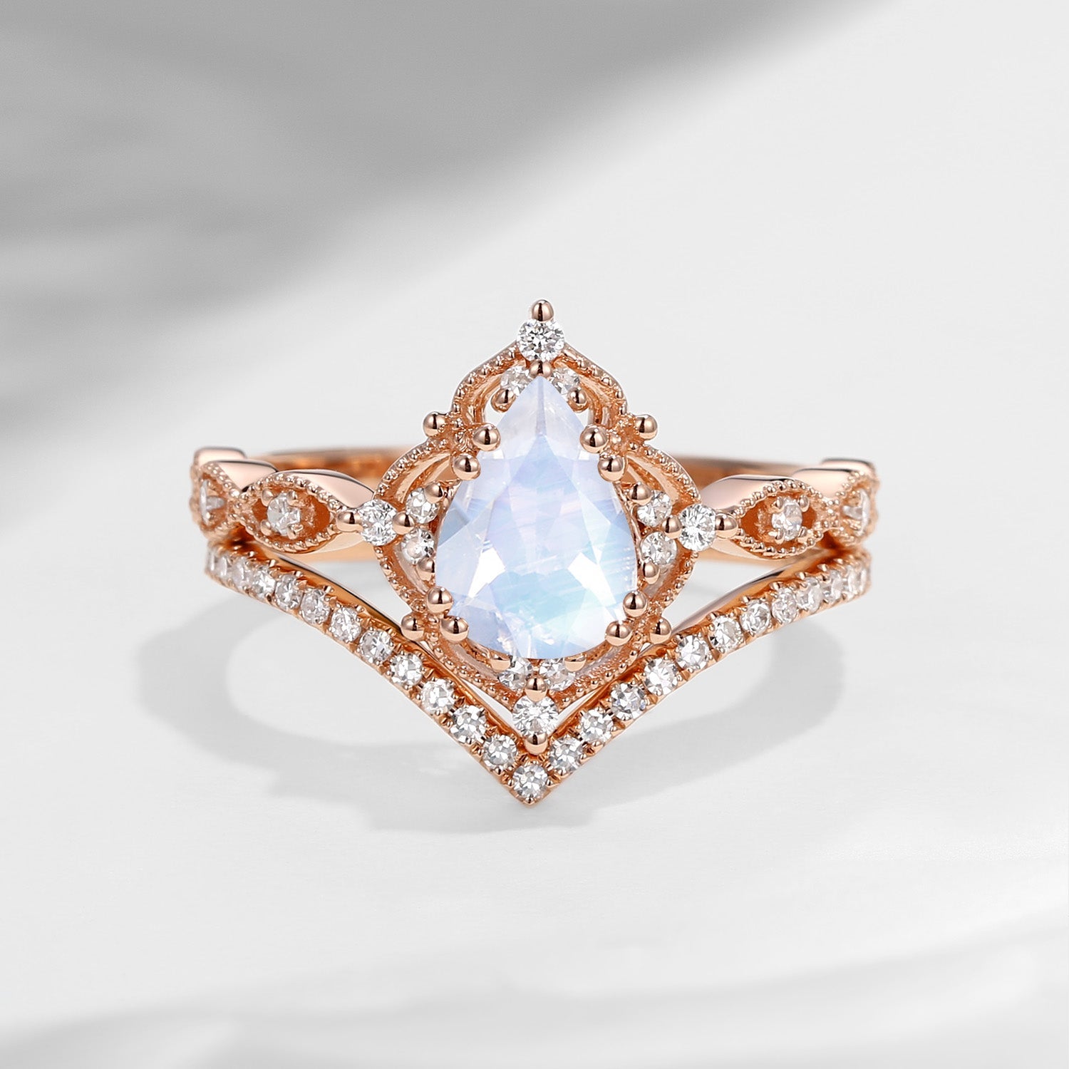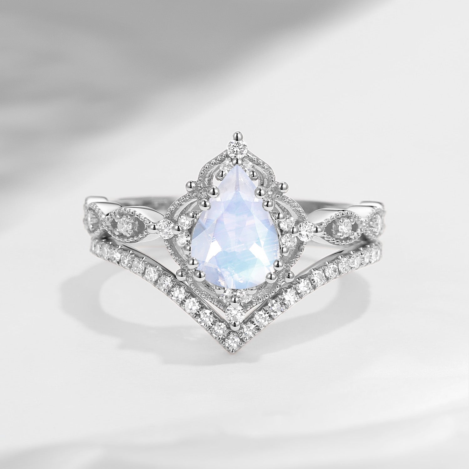 Pear Shaped Moonstone Antique Stacking Engagement Ring 2pcs - Evelyn