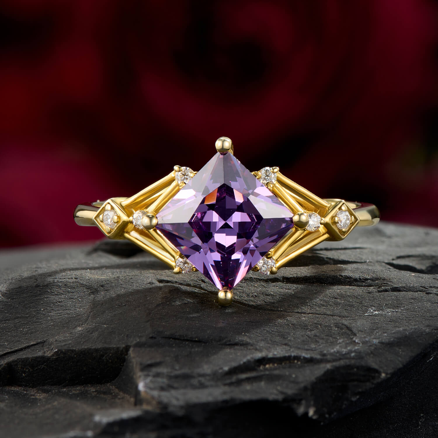 Elegant Princess Cut Amethyst Gold Symmetrical Style Statement Engagement Ring