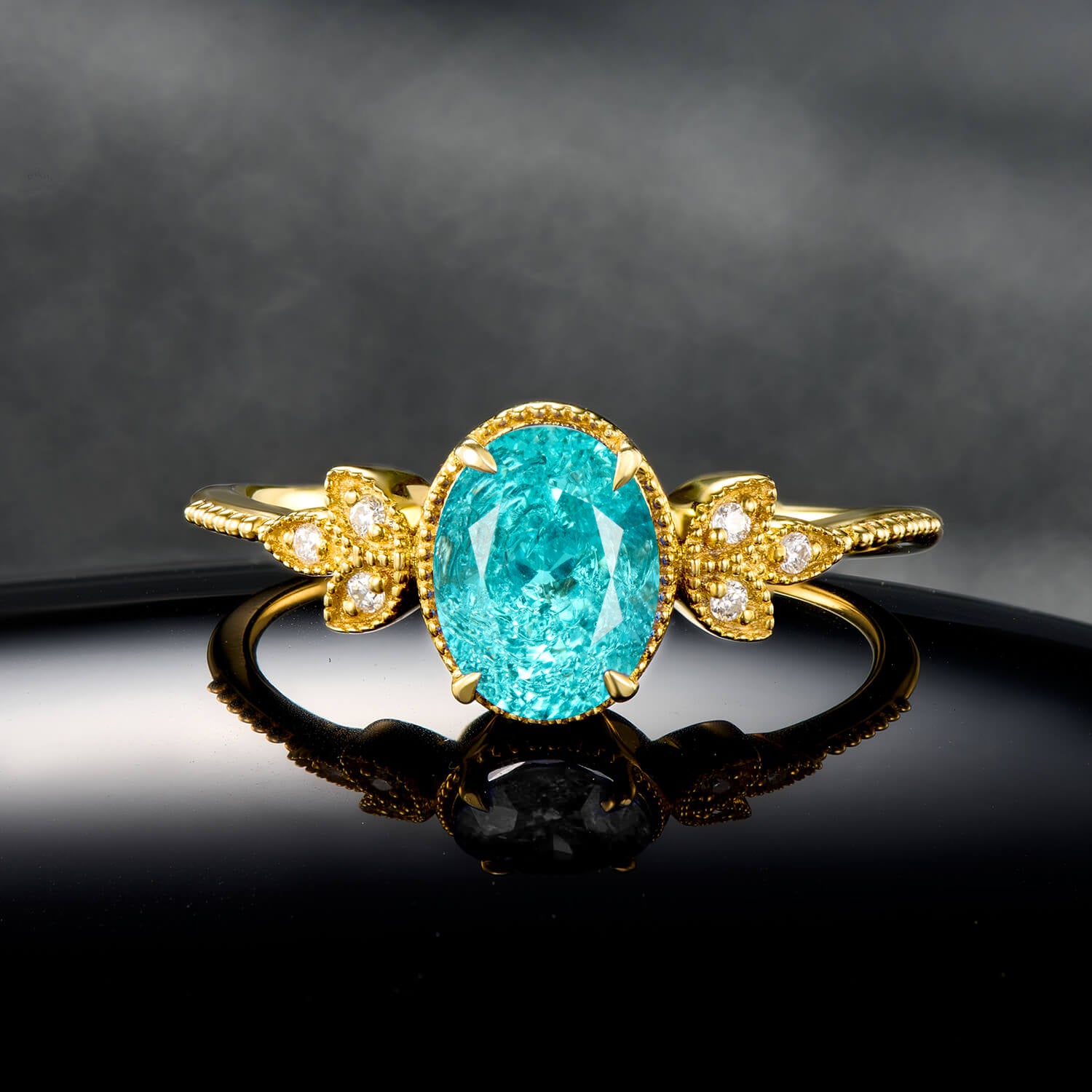 Tropical Mirage Oval Cut Paraíba Tourmaline Ring in Gold Delicate Clover Style Statement Engagement Ring