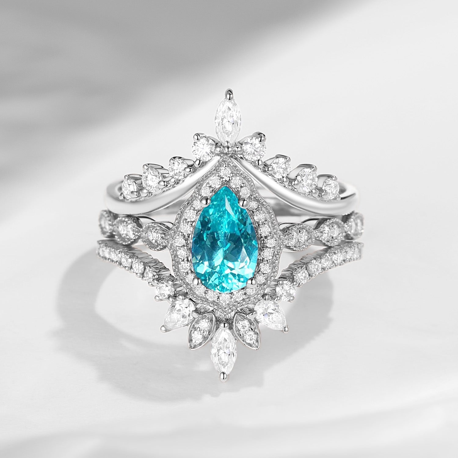 Pear Cut Lab Paraiba Cluster Engagement Ring Set 2pcs - Vivian