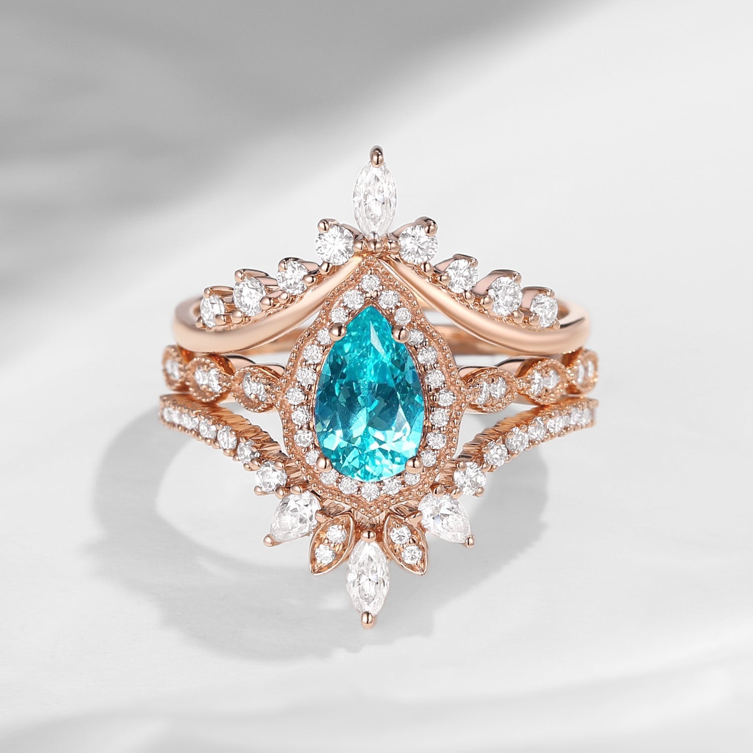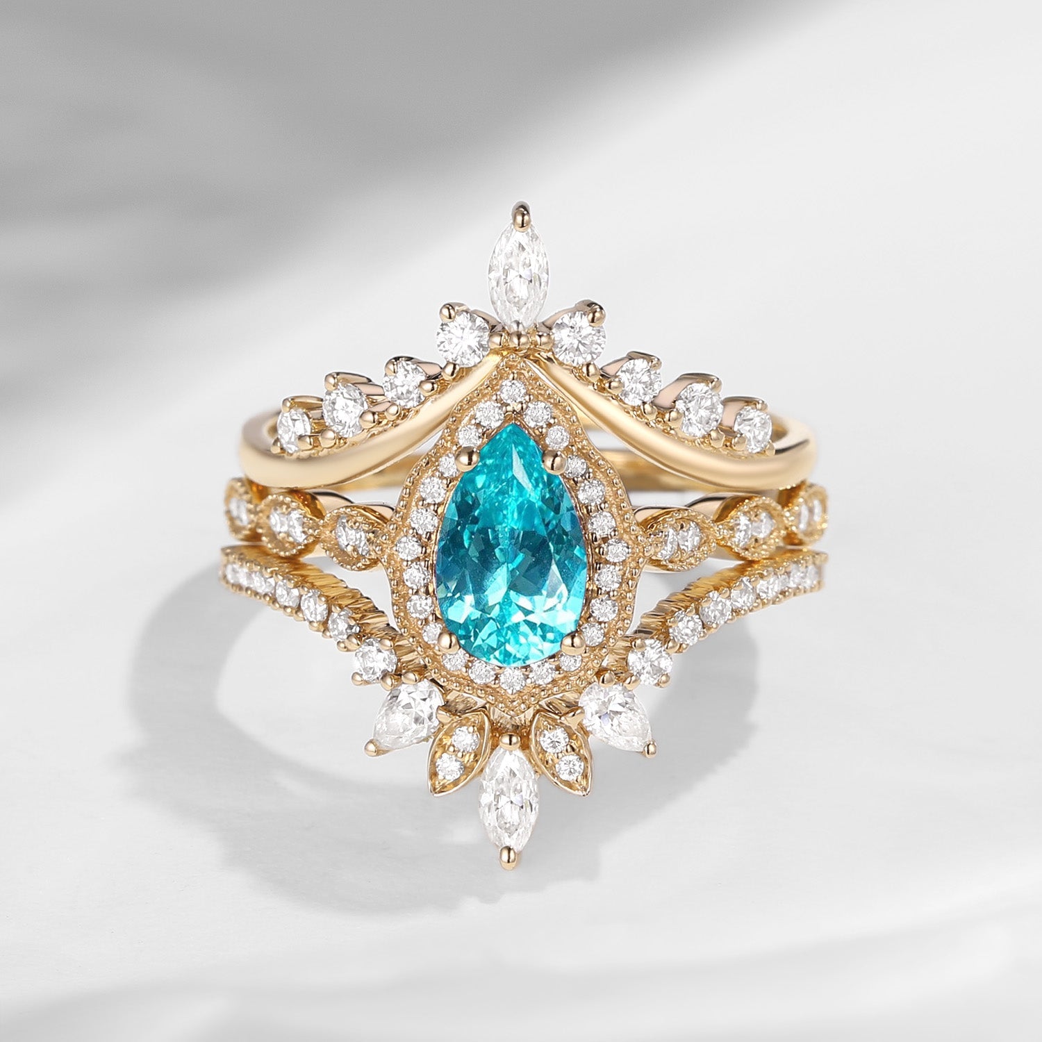 Vintage Inspired Pear Shaped Milgrain Lab Paraiba Engagement Ring Set 3pcs - Diva