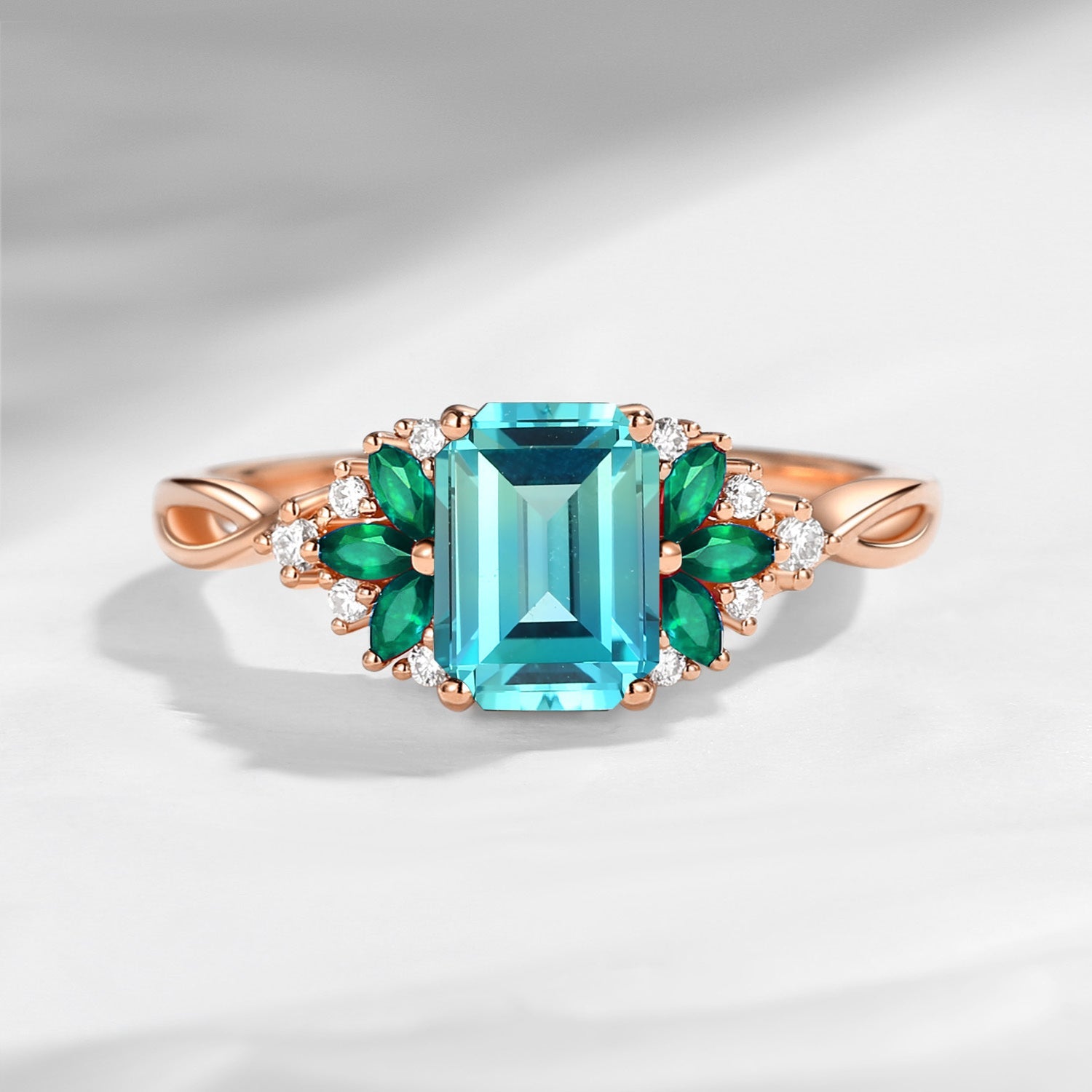 Cluster Emerald Cut Lab Paraiba & Emerald Twist Engagement Ring