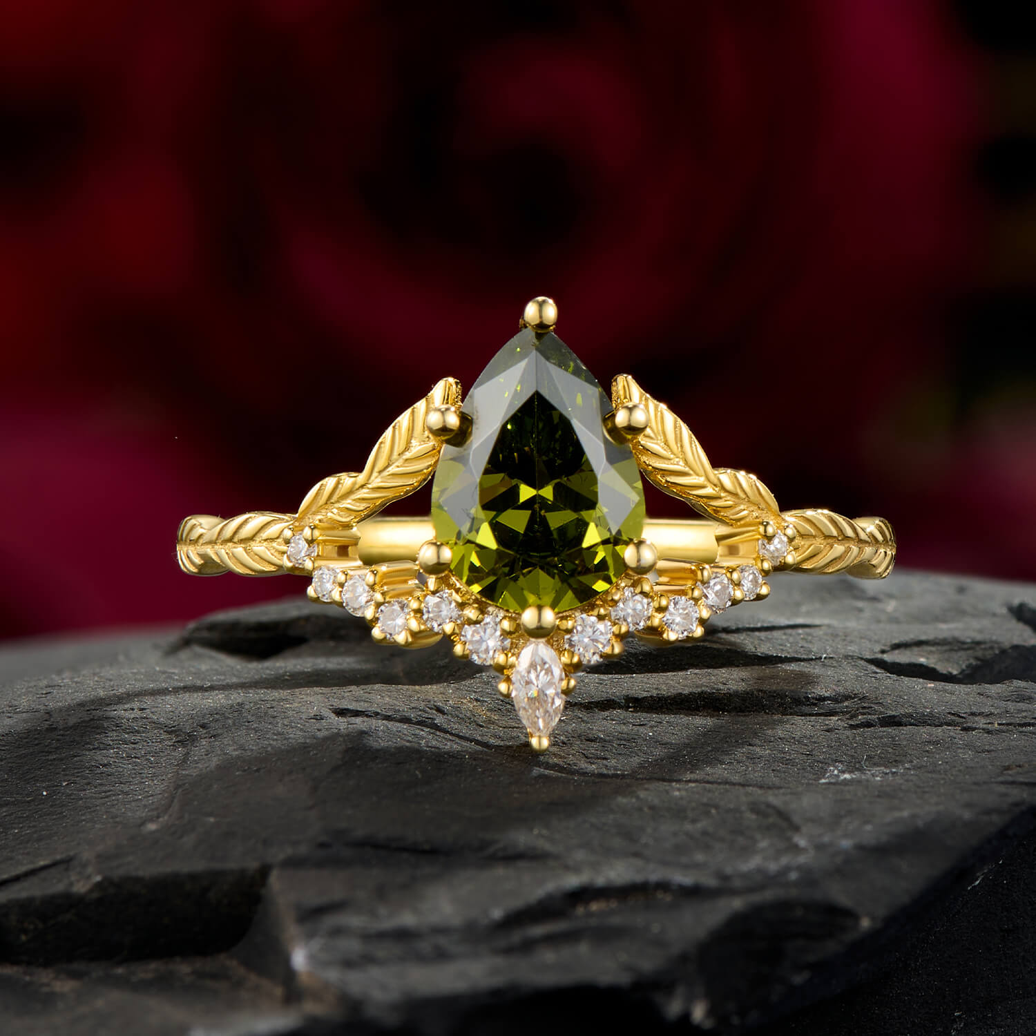 Verdant Grace Pear Cut Peridot Ring Gold Botanical Sculptural Engagement Ring