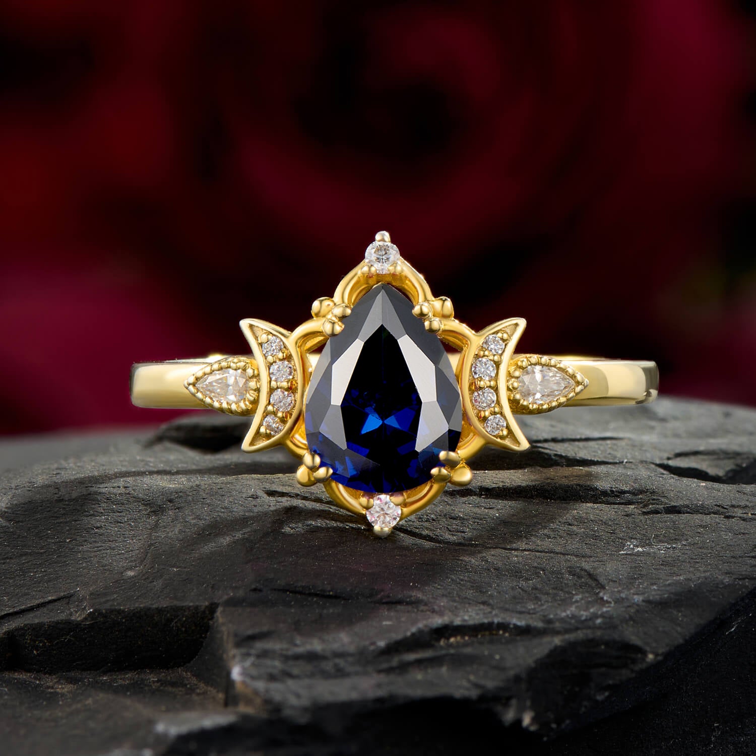 Deep Radiant Pear Sapphire Yellow Gold Crescent Engagement Ring