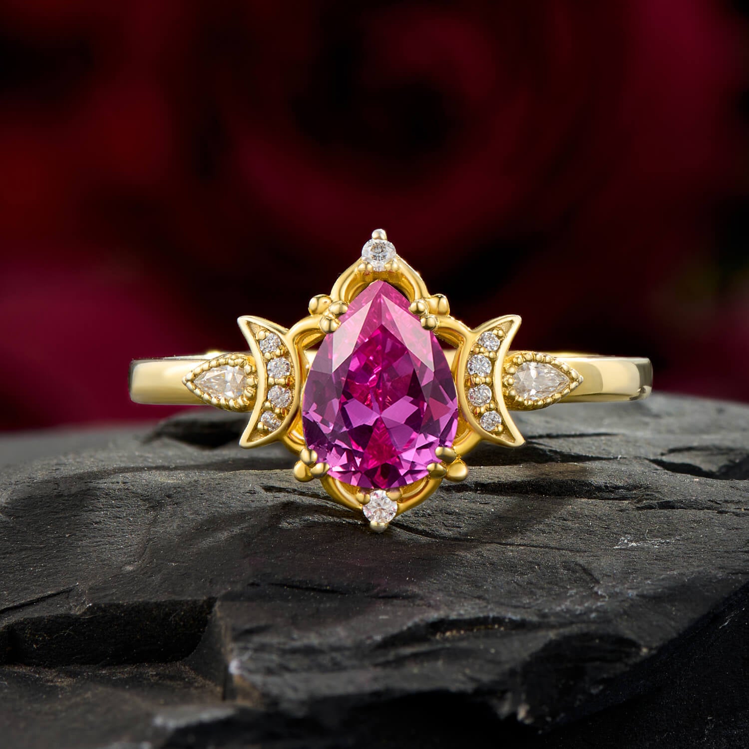 Romantic Pear Rose Sapphire Yellow Gold Crescent Engagement Ring