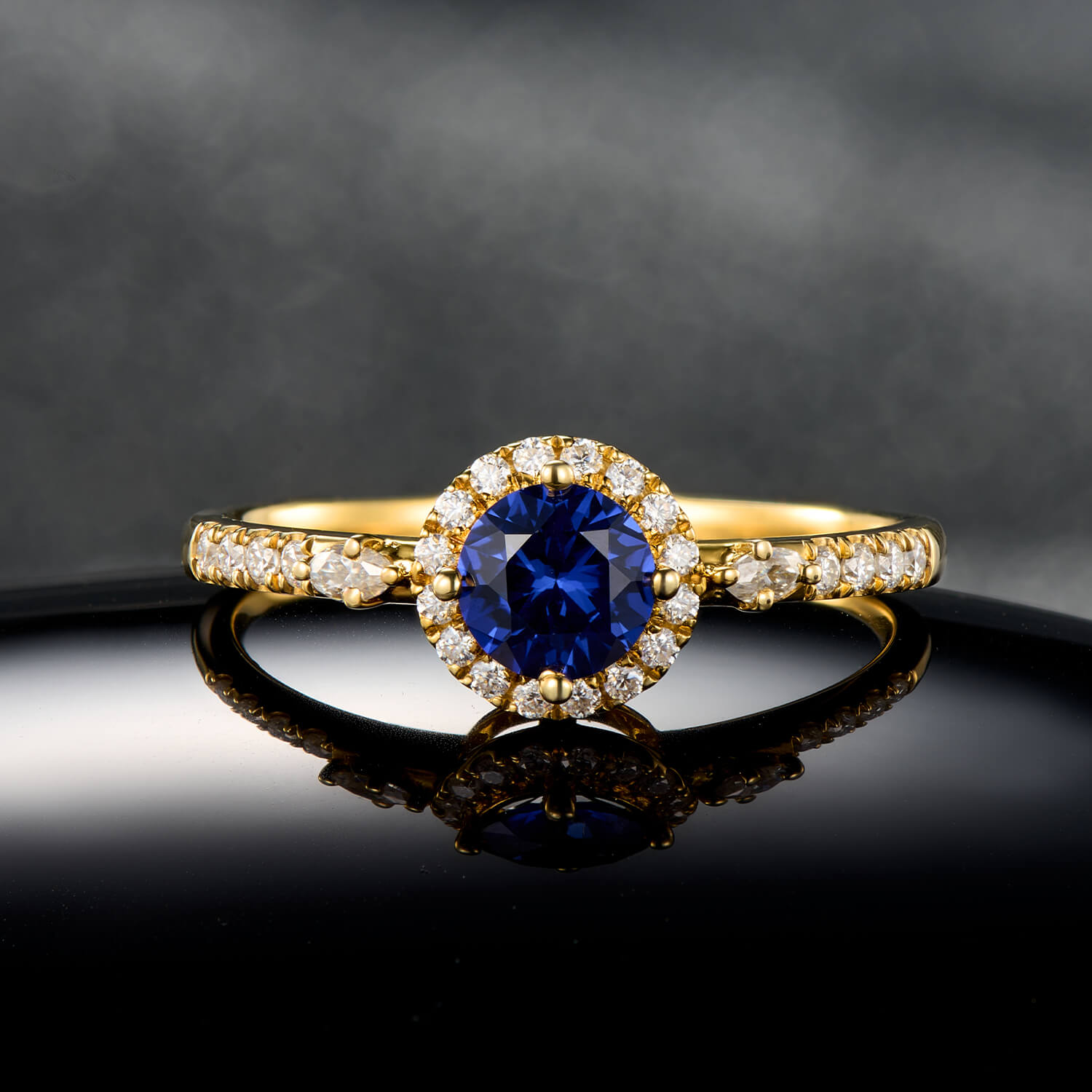 Radiant Round Cut Sapphire Ring in Gold Halo Style Elegant Statement Engagement Ring